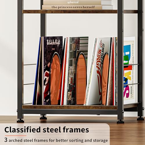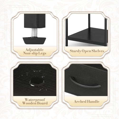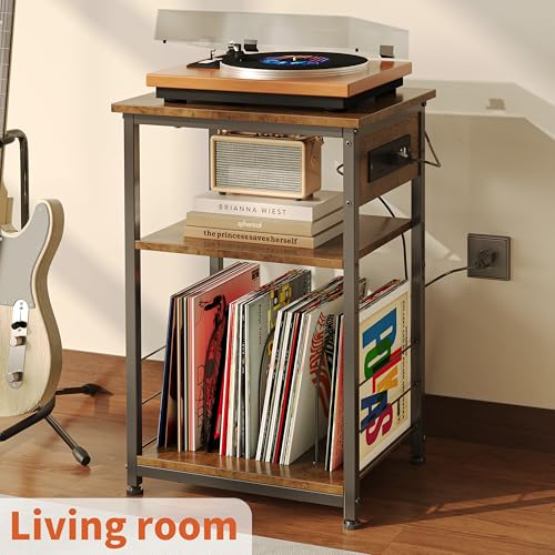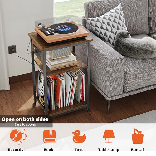 JOISCOPE Side/End Table with Charging Station (2 AC, 2 USB), 3 Tier Record Player Stand for Up to 150 Albums Storage, Portable Bedside Nightstand on 4 Wheels for Small Space Bedroom Living Room, Black