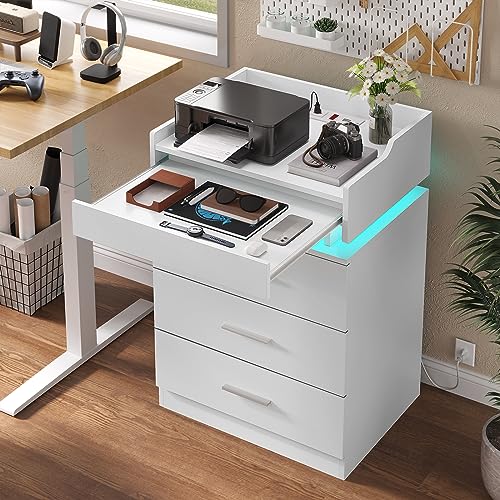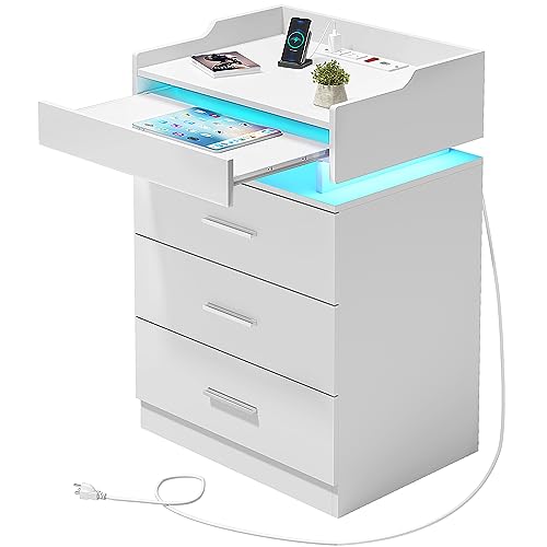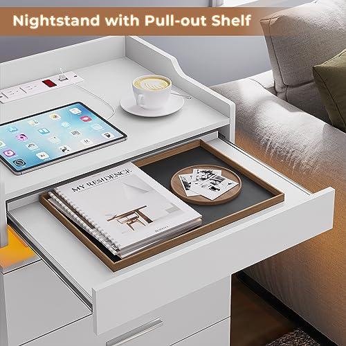 LED Nightstand with Charging Station,Night Stand with Pull-out Shelf,Bedside Table with Drawers,Modern End Table Side Table Storage Cabniet,White