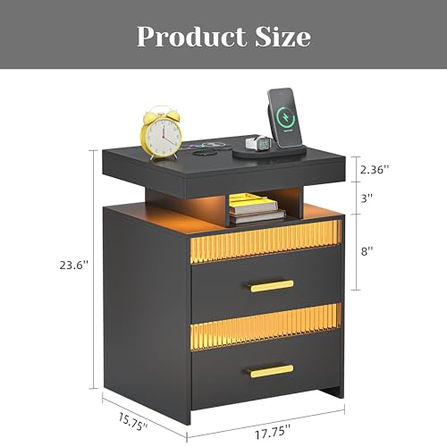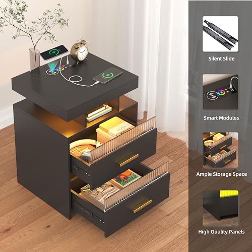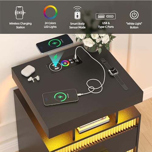 Nightstand,Bedside Table with Wireless Charging Station and LED Lights, Modern Bedside Table with 24 Color LED Lights,3 Drawers,Open Compartment