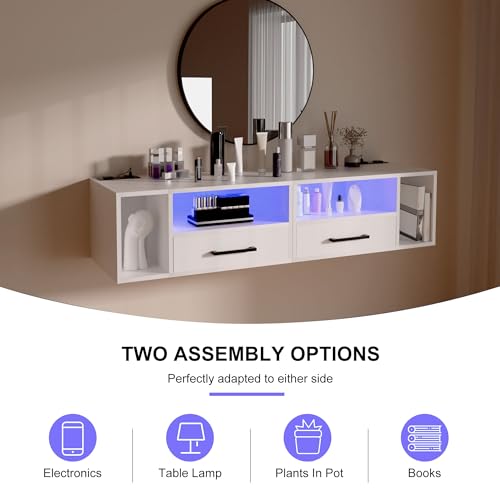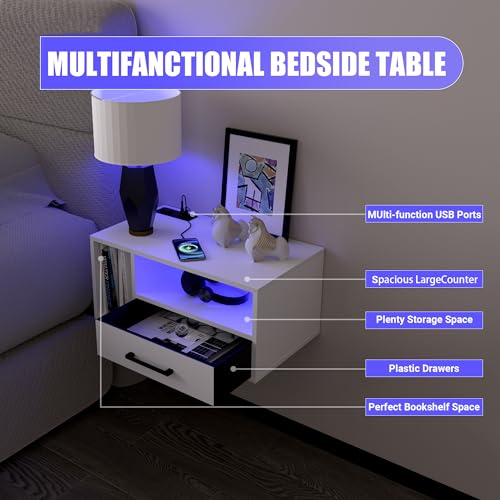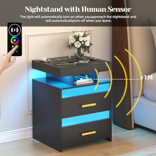 Nightstand with Charging Station and LED Light Strips, 21.3" Table with Drawers,Floating Bedside with USB Ports and Outlets, Bedroom Furniture, Black