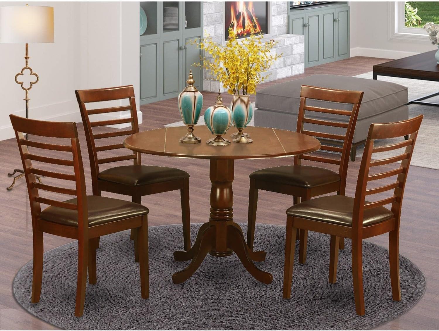 East West Furniture 5 Piece Modern Set Includes a Round Wooden Table with Dropleaf and 4 Faux Leather Upholstered Dining Chairs, 42x42 Inch, DLML5-MAH-LC