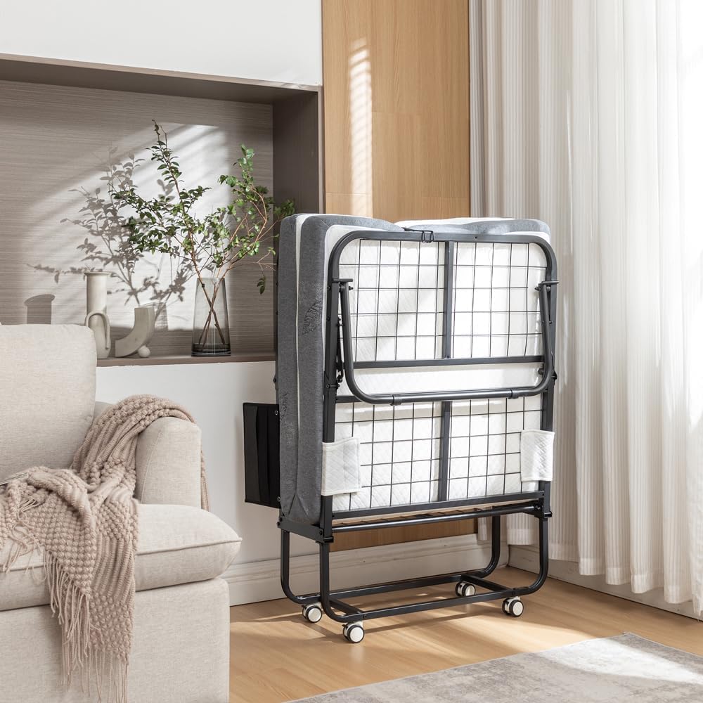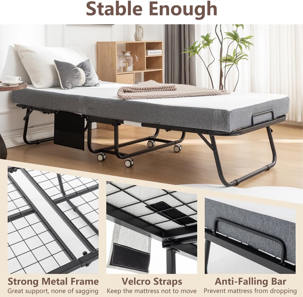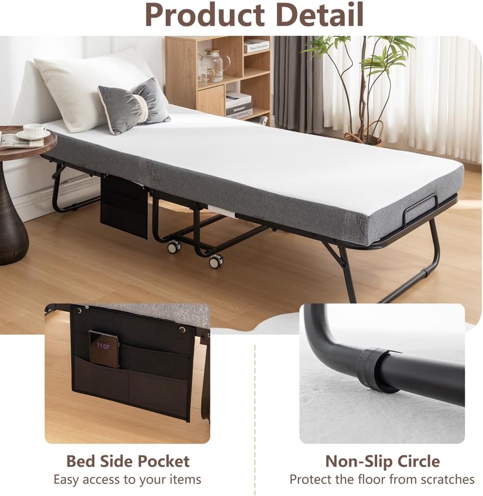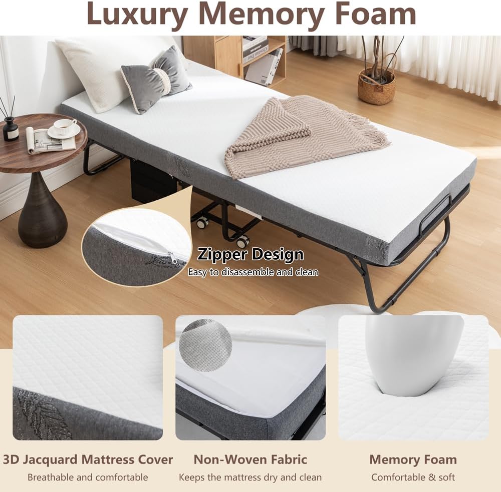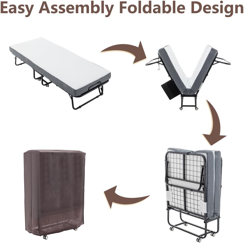 Folding Cot Bed with Mattress for Adults, 75x31 Inches Foldable Metal Platform Bed Frame for Guest with Memory Foam Mattress on Wheels, Saving Space Rollaway Bed, Black Brown