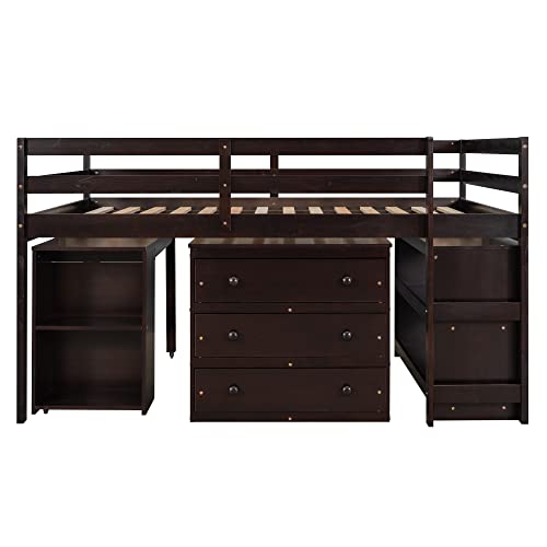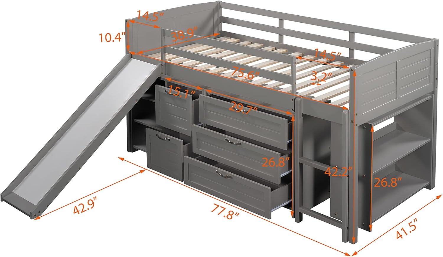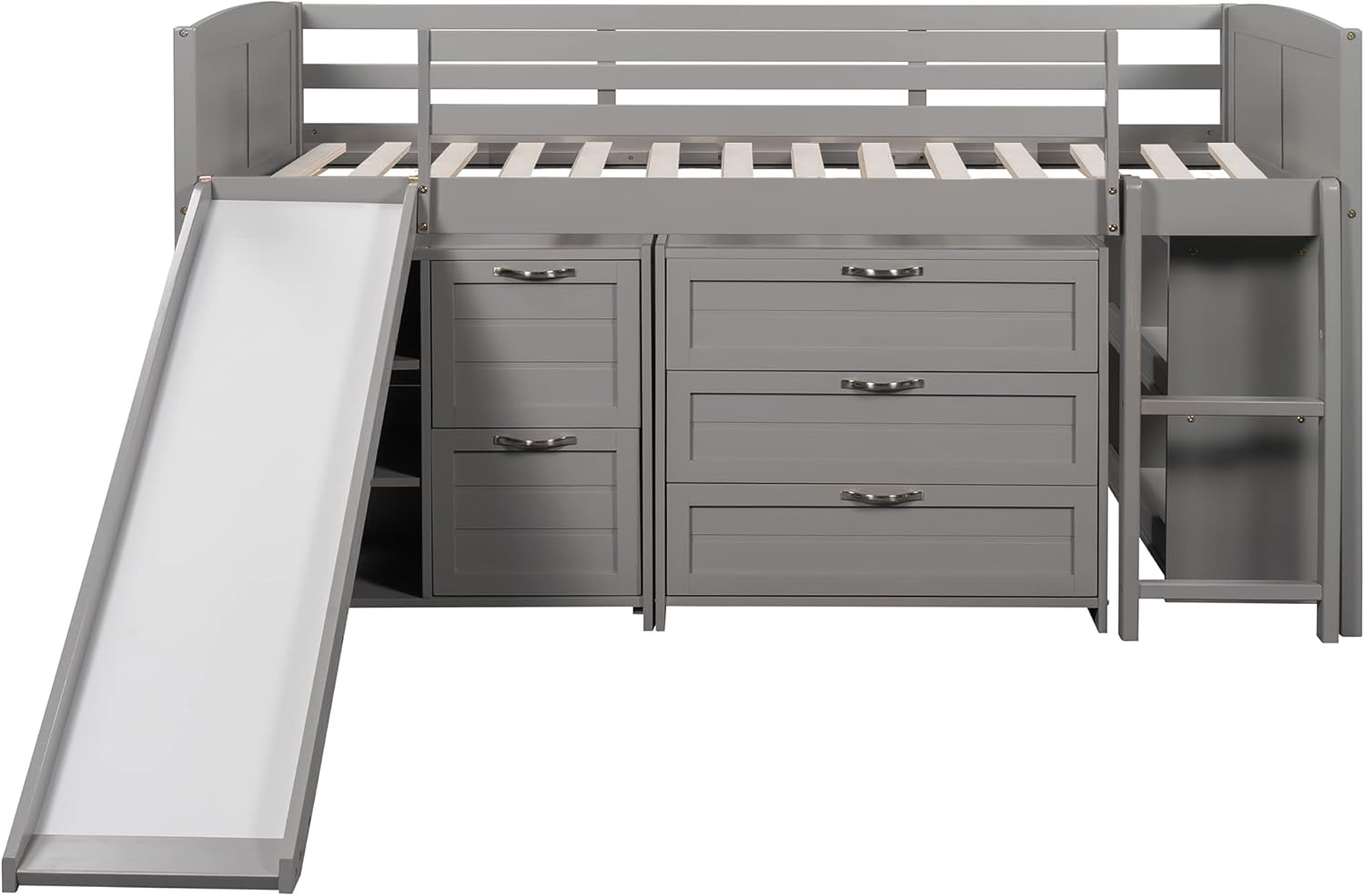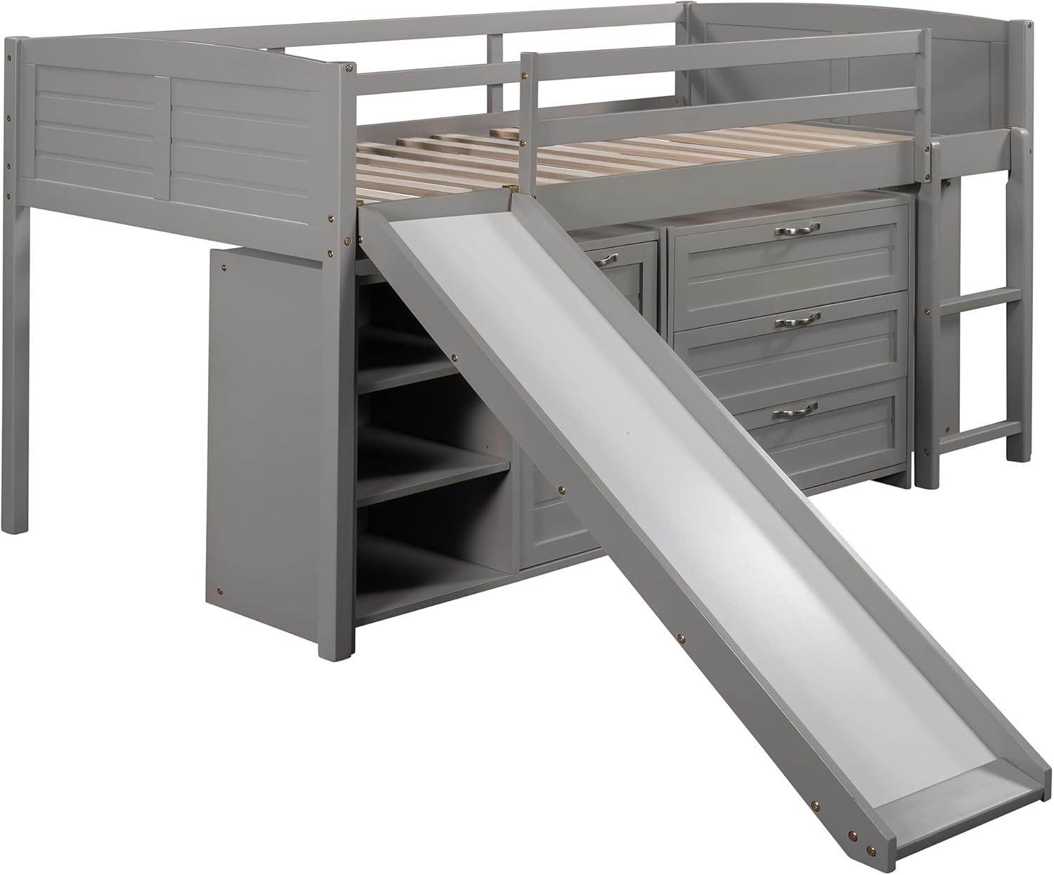 Space-Saving Twin Loft Bed with Cabinets Storage Drawers & Open Shelves, Low Loftbed with Slide & Guardrail for Kids, Teen, Adult, Single Bed Frame Wooden Slats Support No Box Spring Needed