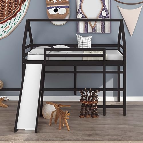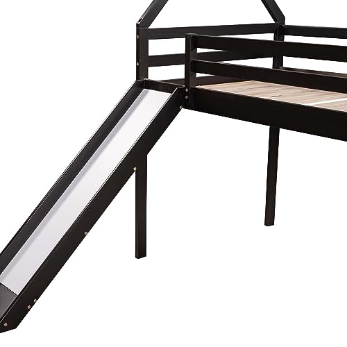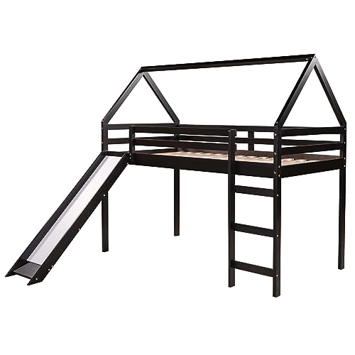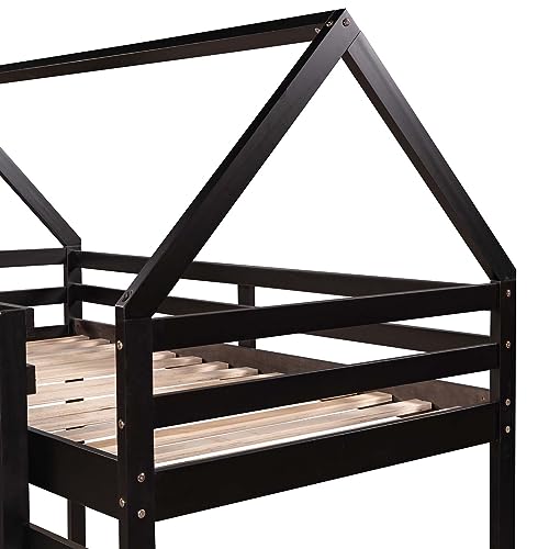Twin Size Loft Bed with Slides, House Shape Solid Pine Wooden Bed Frame with Rails and Step Storage Drawers, No Box Spring Required, Space Saving Design for Teens, Girls, Boys (Espresso)