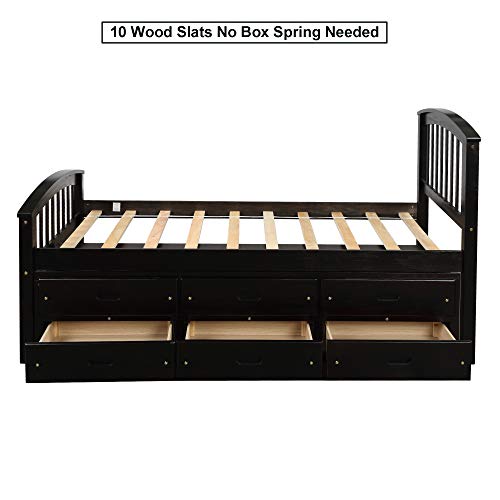JULYFOX Wood Bed Frame Queen with Storage, Solid Pine Wood Platform Bed with Headboard 4 Drawers Underneath 10 Shelves 4 Storage Cabinet No Box Spring Needed Space Saving(Queen,Espresso)