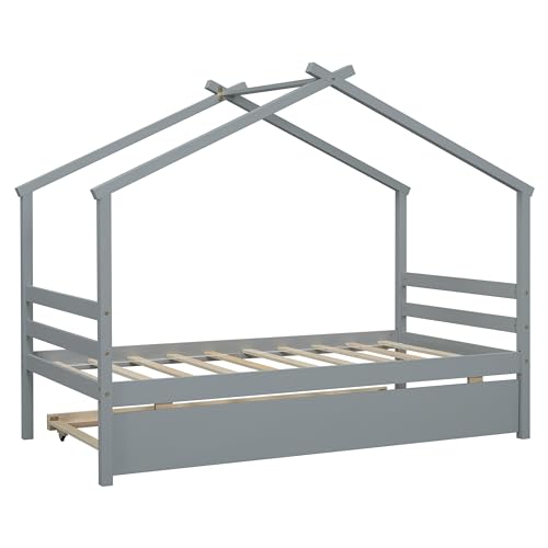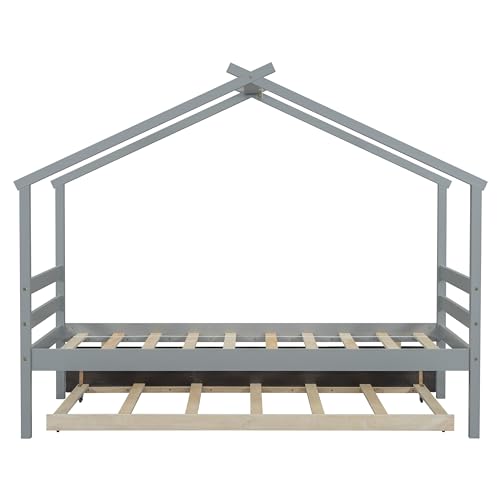 Twin Size Wooden House Bed with Twin Size Trundle, Wooden Platform Bed Frame with Roof for Teens, Boys or Girls, Space-Saving Kids' Bed Twin Size, No Box Spring Needed, Easy Assembly, Grey