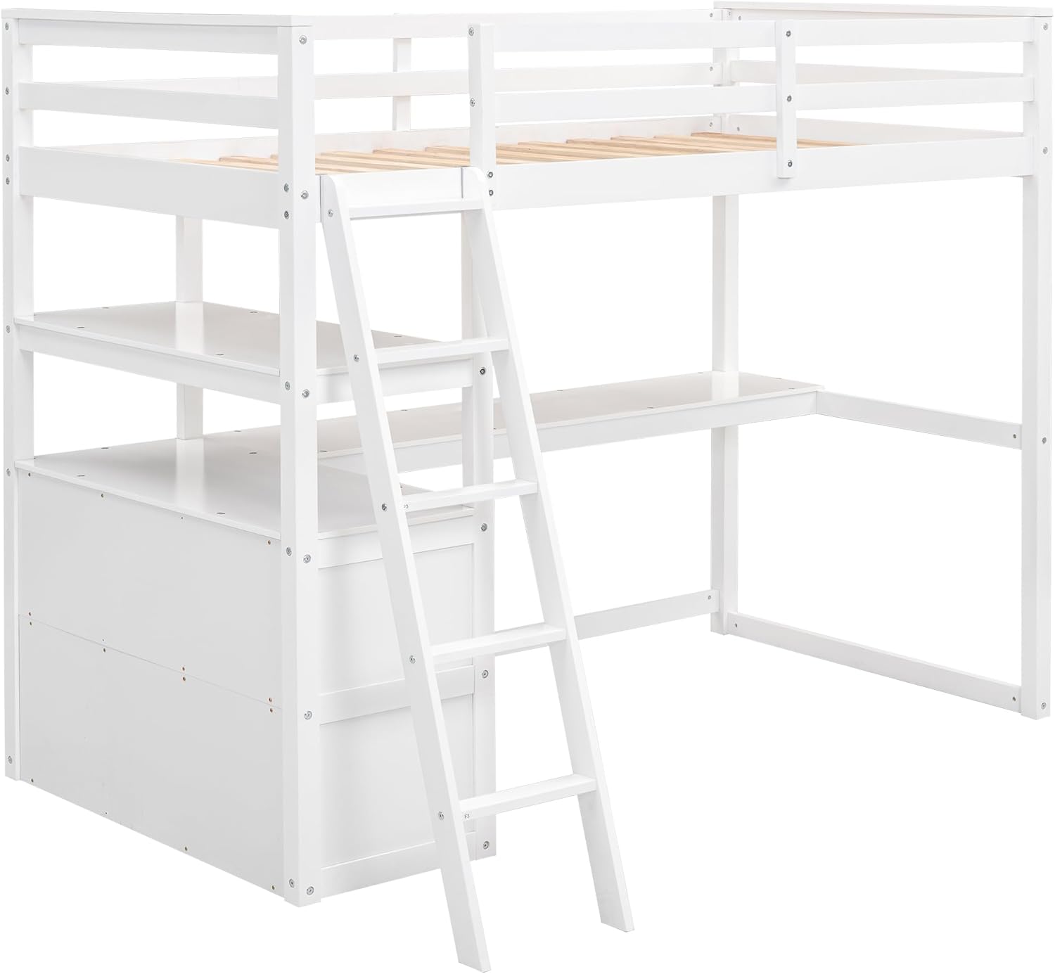 Twin Size Loft Bed with Desk and Shelves,Wooden Bedframe with Two Built-in Drawers for Bedroom,White