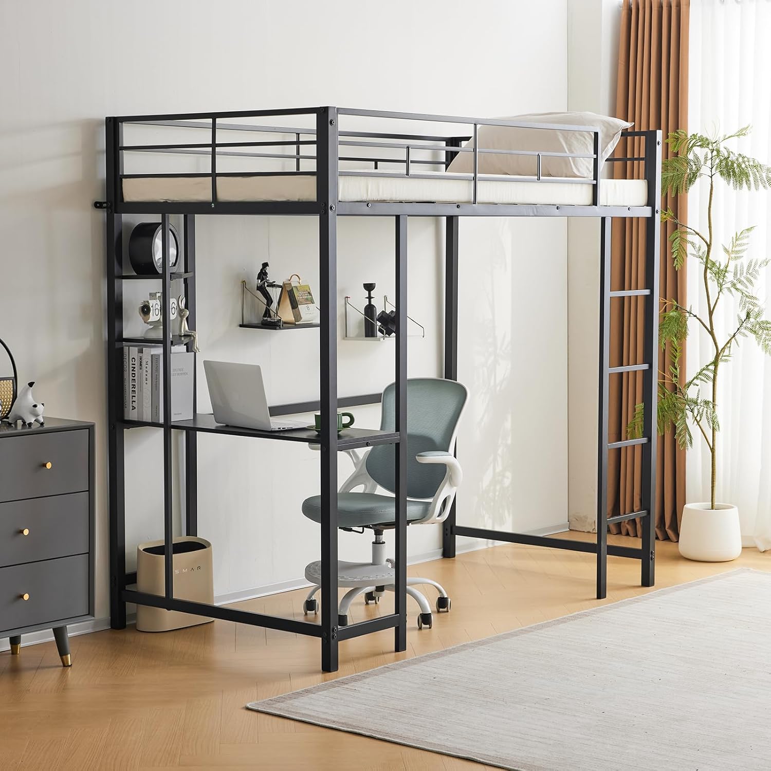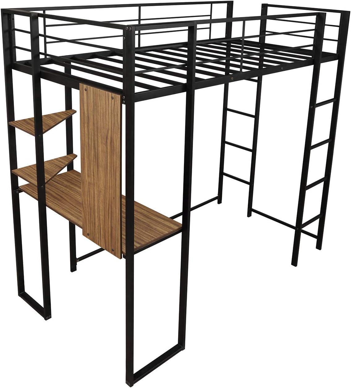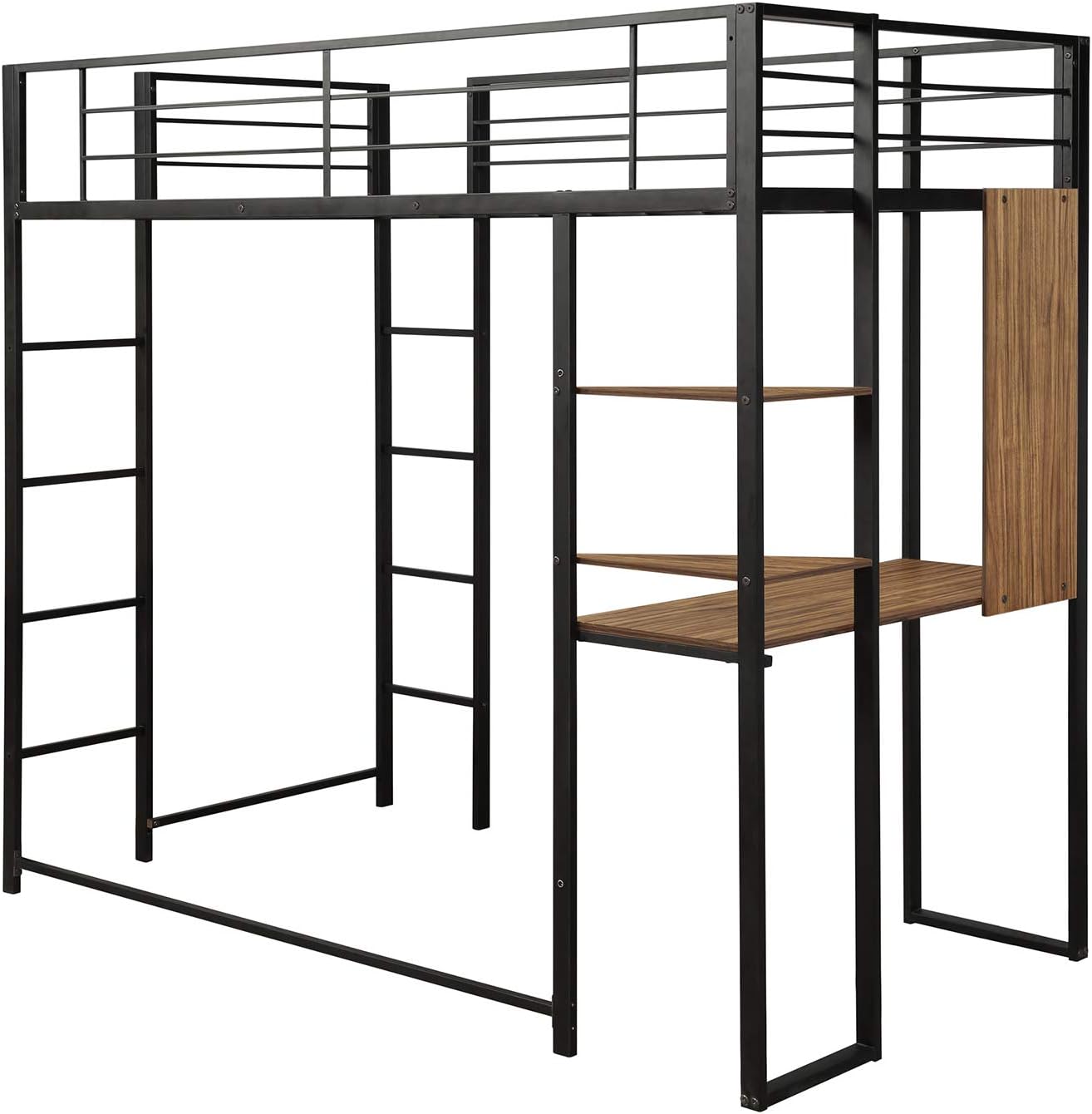 Modern Metal Loft Bed Frame with Desk and Storage Shelves - Twin Size, Integrated Ladders & Guardrails, Space-Saving Design, Black