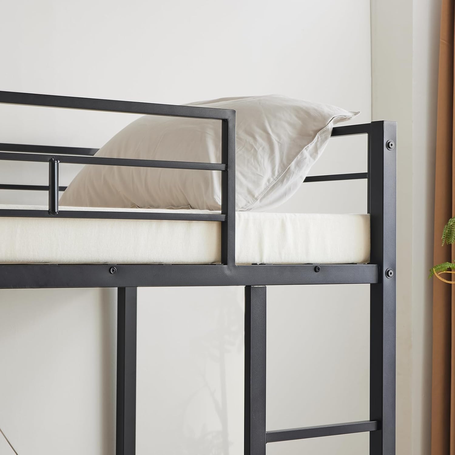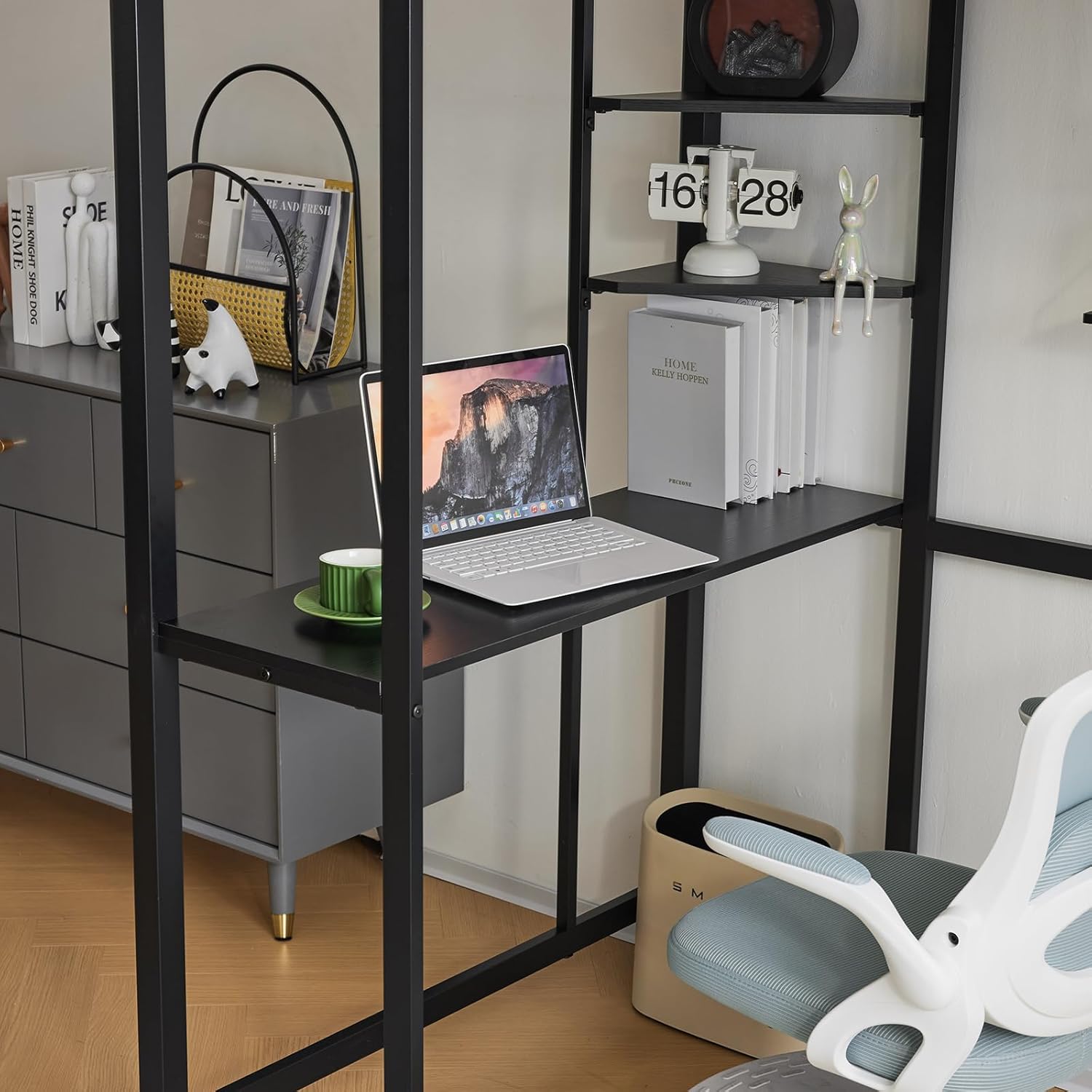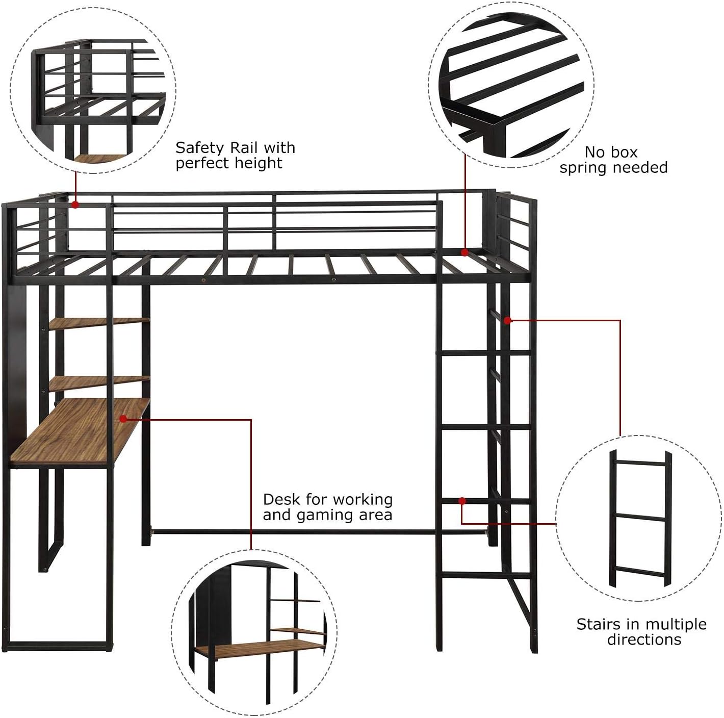 Modern Metal Loft Bed Frame with Desk and Storage Shelves - Twin Size, Integrated Ladders & Guardrails, Space-Saving Design, Black