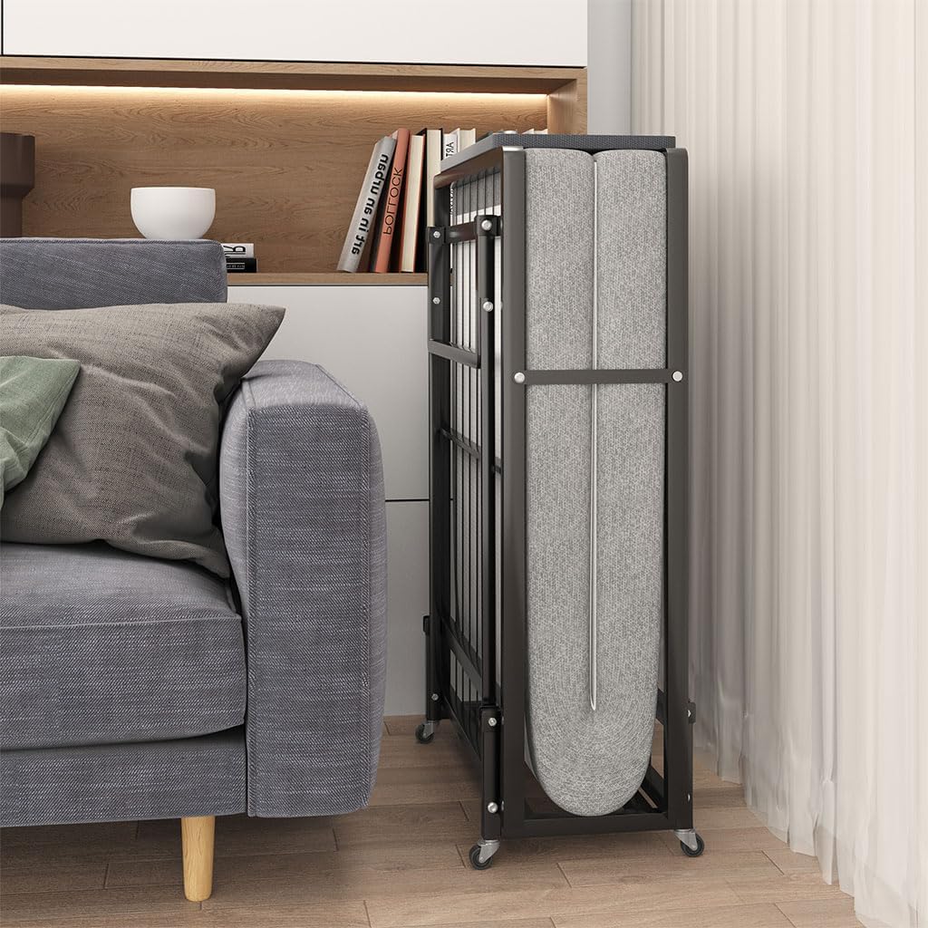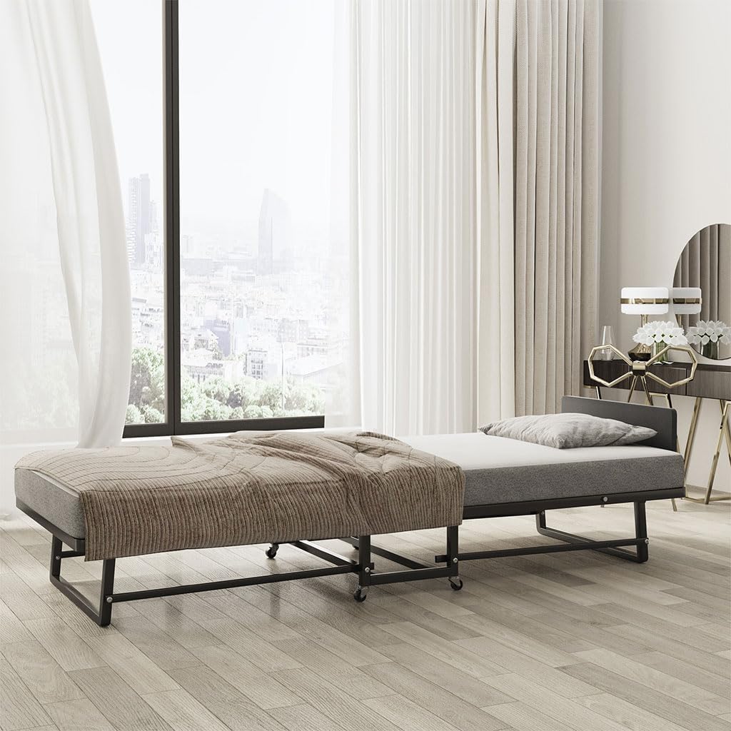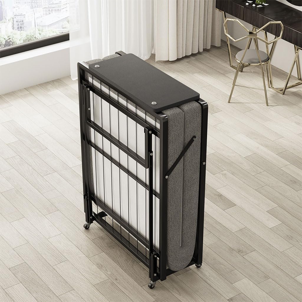 Folding Bed with Mattress - Single Size Portable Foldable Roll Away Adult Bed with 4 Lockable Wheels and Metal Frame Space Saving Fold Up Bed for Easy Storage