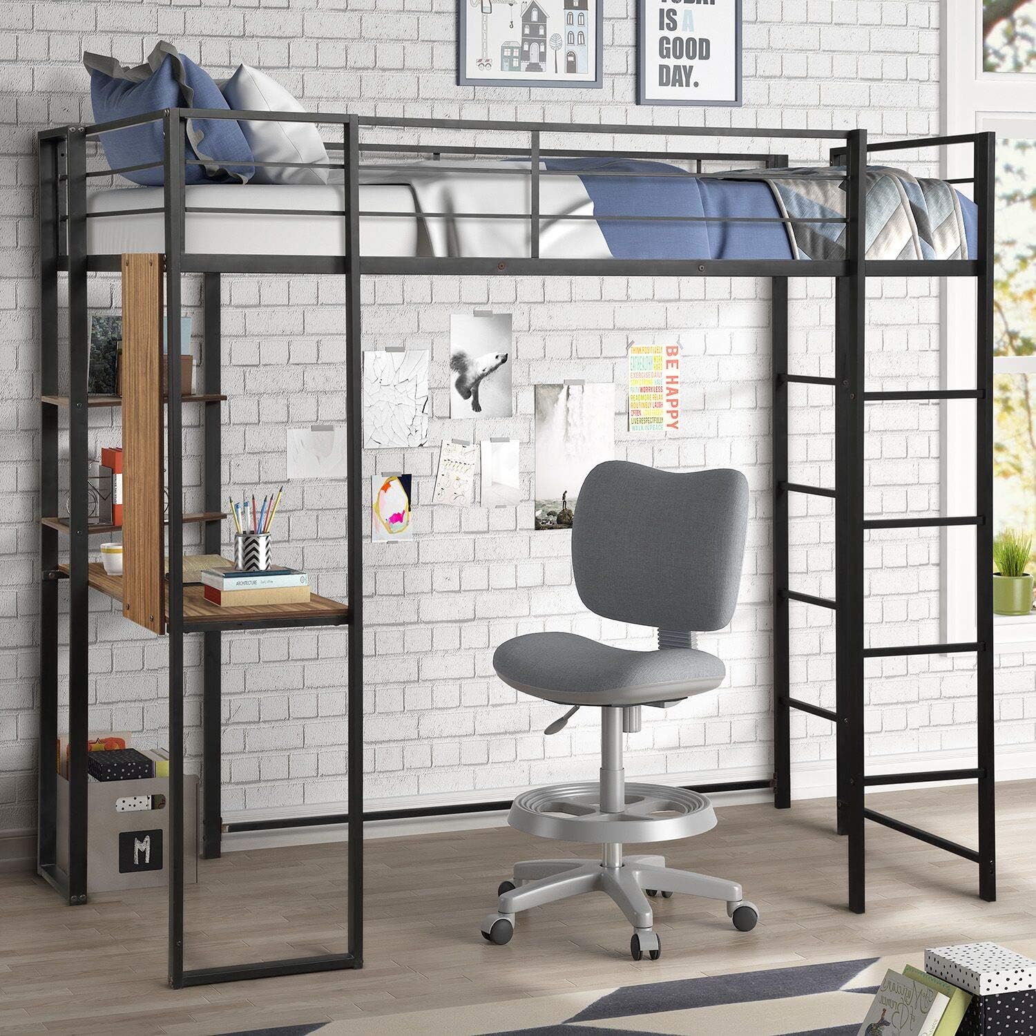 Loft Twin Bed Single Bunk Bed with 2 Shelves and one Desk Danxee Space-Saving Bunkbed High Sleeper Multipurpose Use Full-Length Guardrails & Two Integrated Ladders