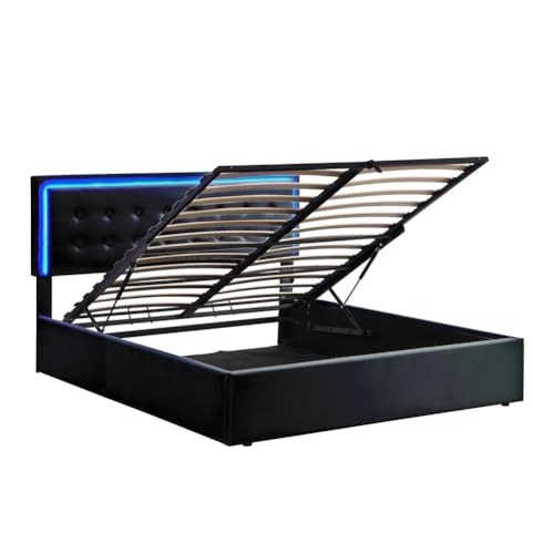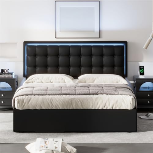 Queen Size Bed Frame, Platform Bed Frame with Hydraulic Storage System, LED Lights, Space Saving, Tufted Upholstered Platform Bed, Easy Assembly for Bedroom
