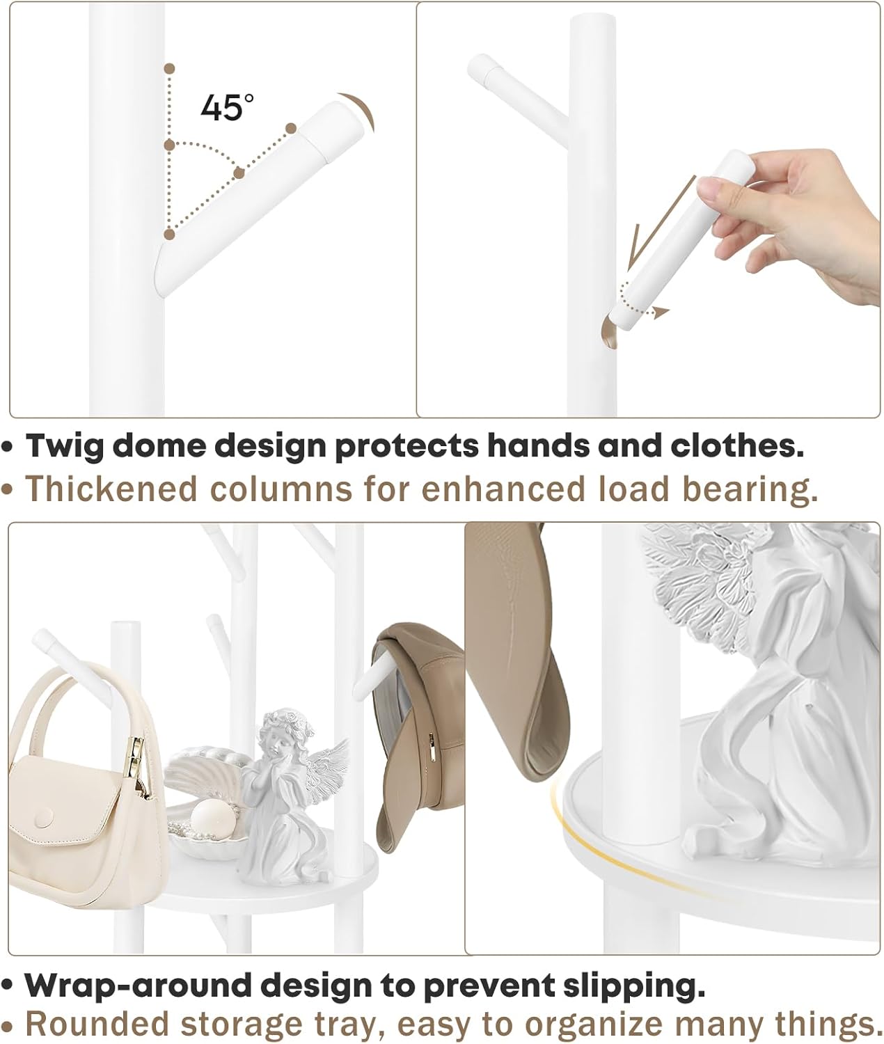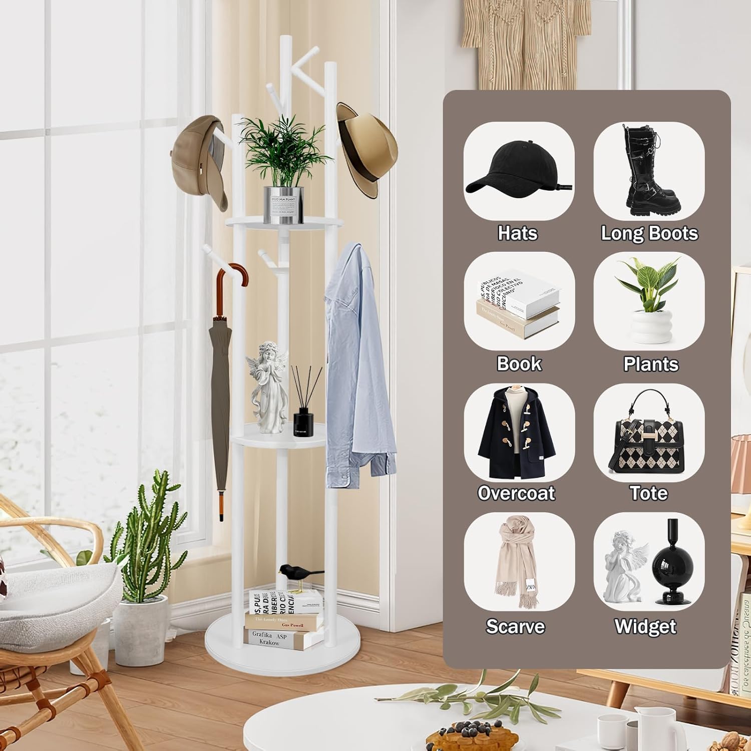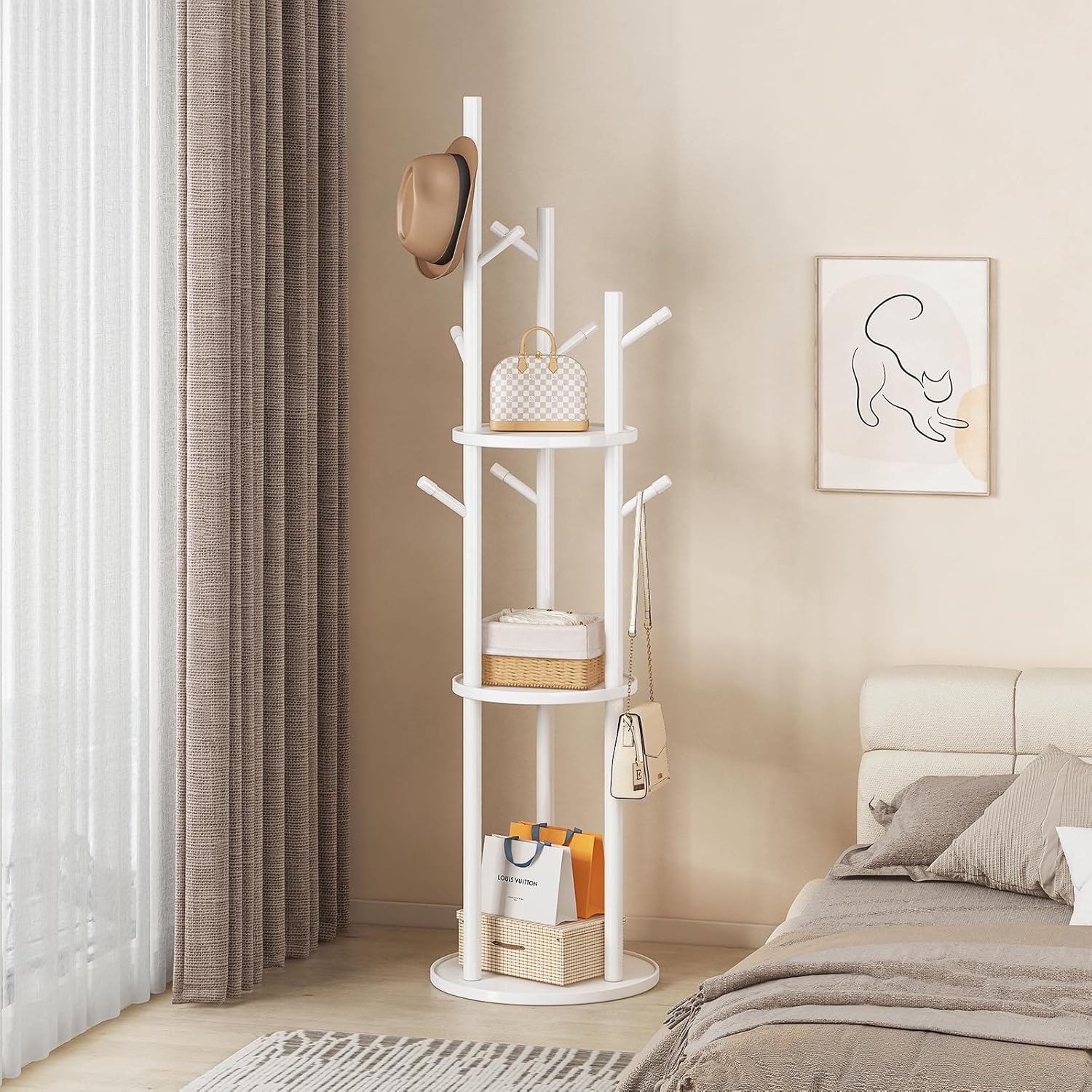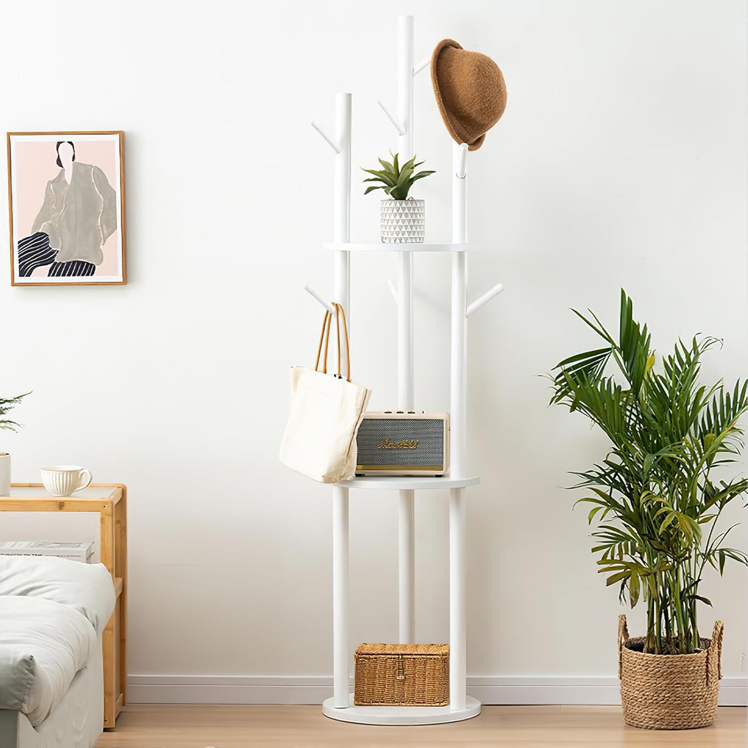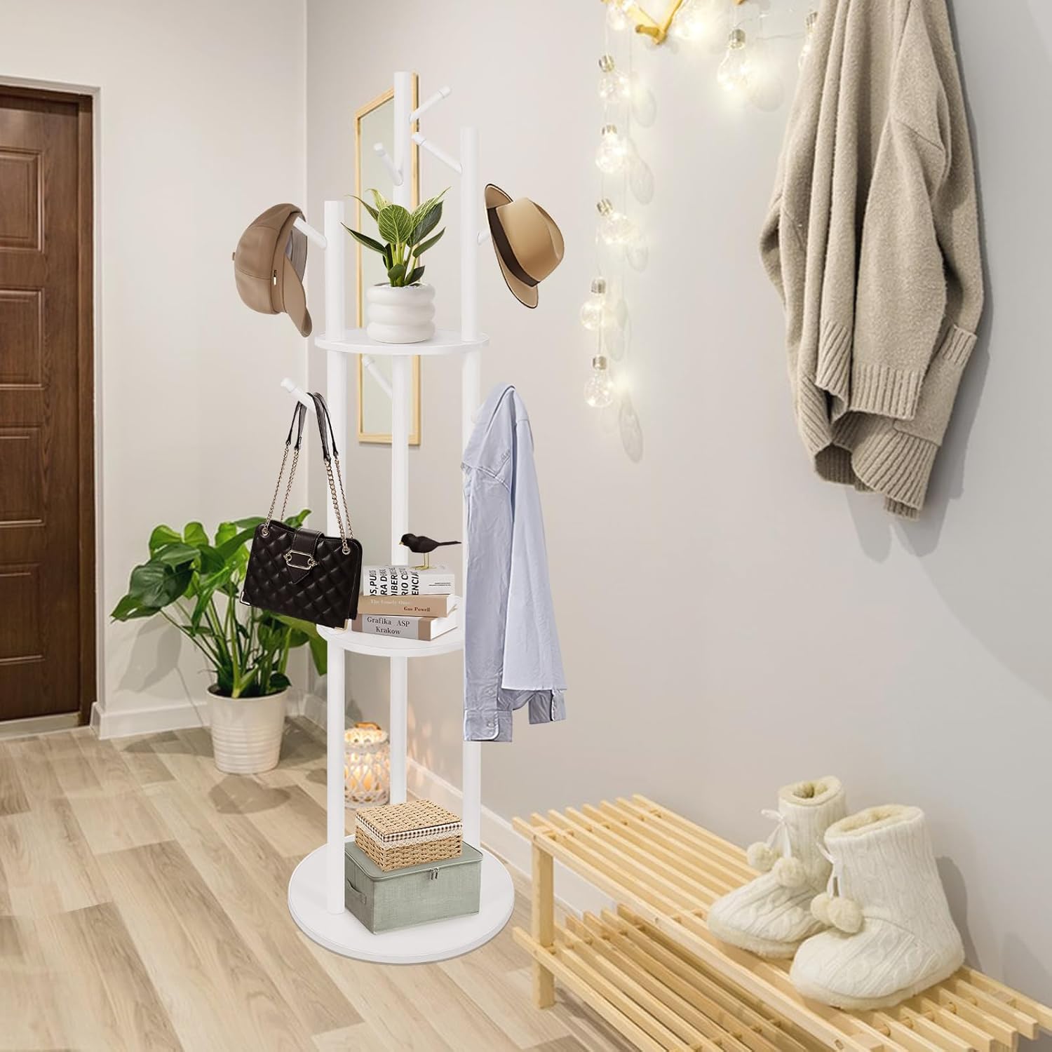 Coat Rack Freestanding Wooden Hat Rack Stand with 9 Hooks and 3 Round Tray Storage Shelves for Hanging Clothes Hats Bags Umbrella Keys for Entryway,Hallway,Bedroom (White)