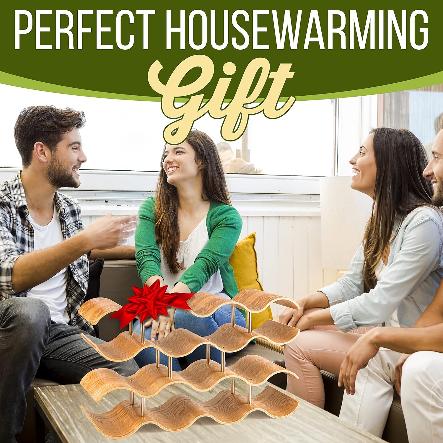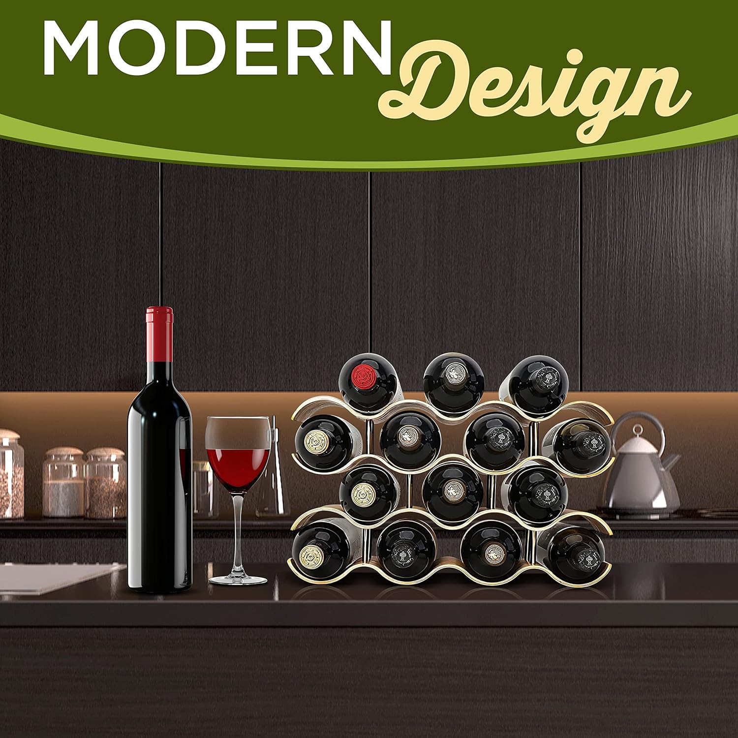 SereneLife Bamboo Wine Rack - 4 Tier Countertop Shelf with Slots That Holds 14 Bottles, Unique Stackable Wooden Holder, Save Space for Cabinet, Kitchen and Pantry, Modern Contemporary Wave Design