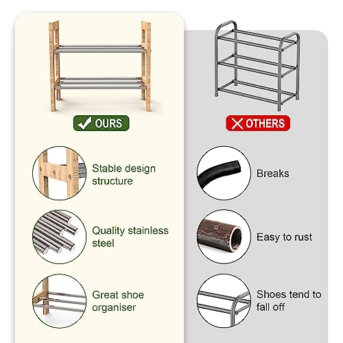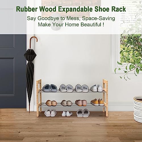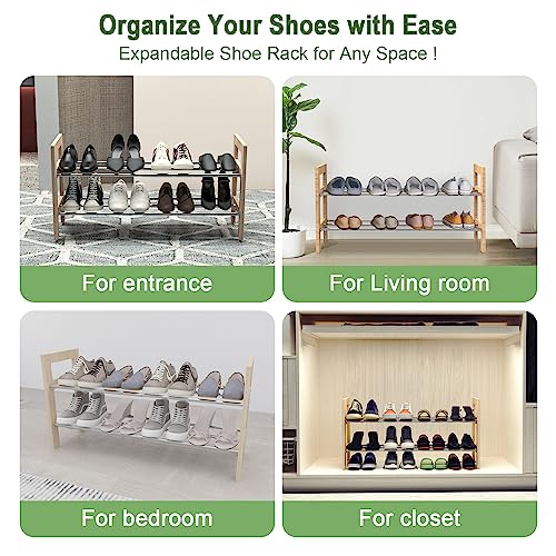 2 Tier Expandable Shoe Rack, Adjustable Shoes Organizer Storage Shelf, Wooden and Metal Free Standing Shoe Rack for Closet Entryway Doorway and Small Space (2-tier)