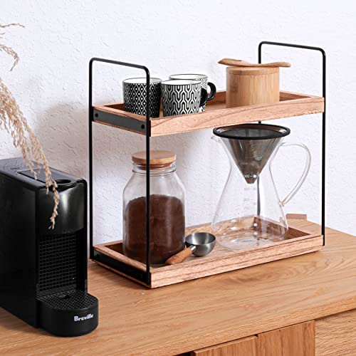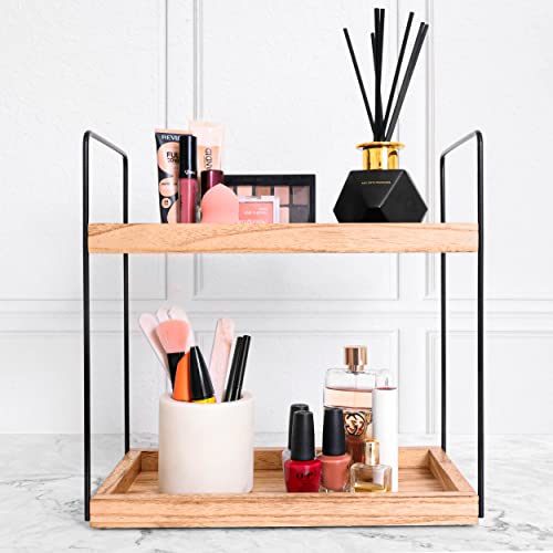 2 Tier Bathroom Countertop Organizer Lightly Lacquered to Resist Water and Stains - Easy to Assemble-Tray Standing Decore Bathroom Organizer and Kitchen Spice Rack (Natural Wood)