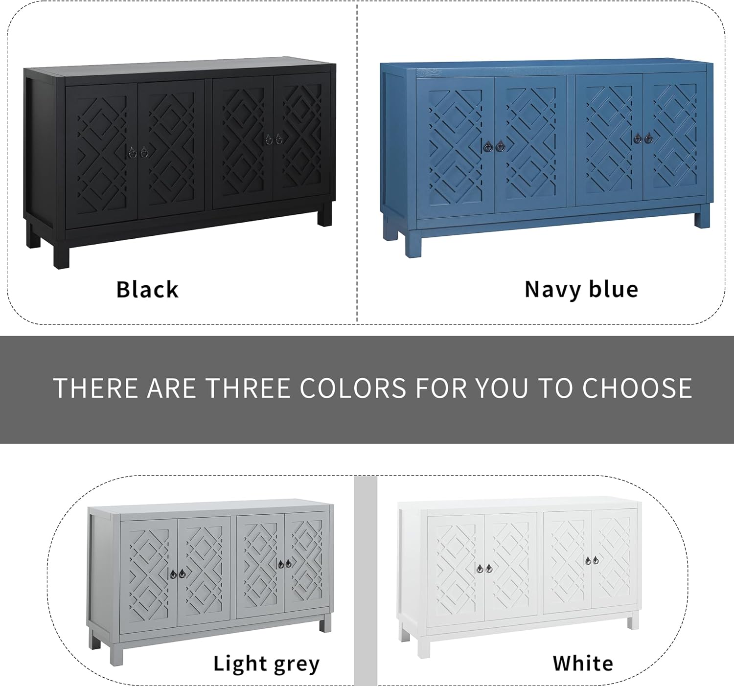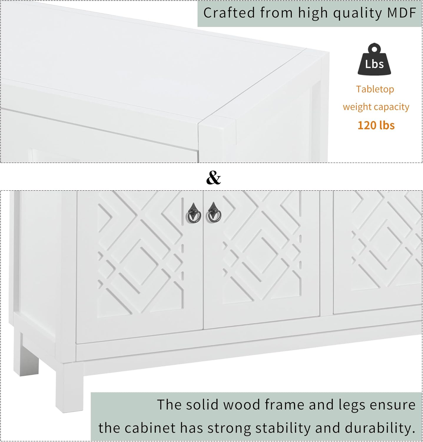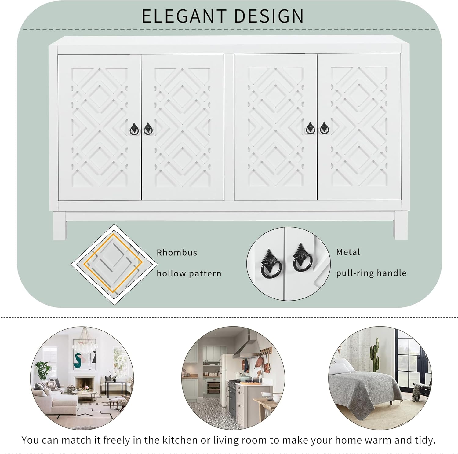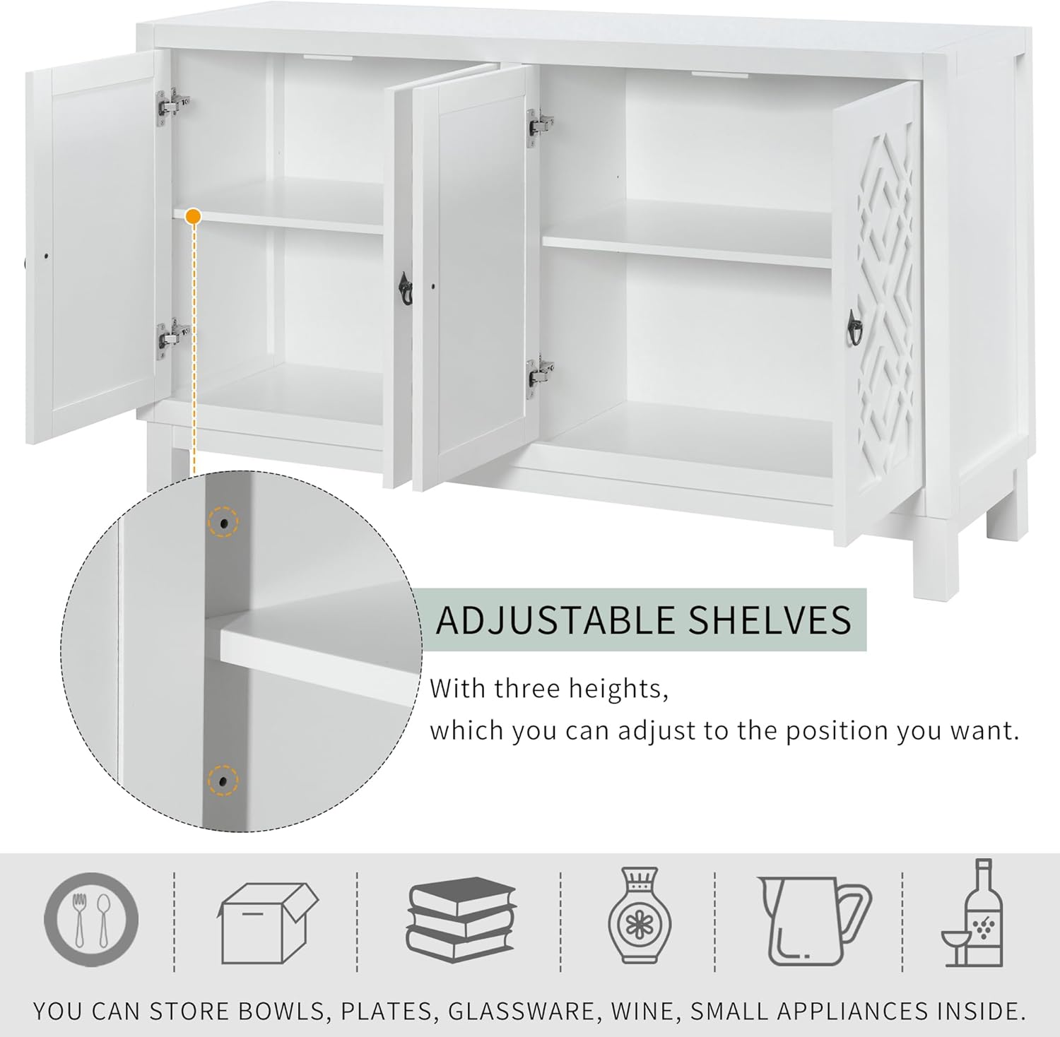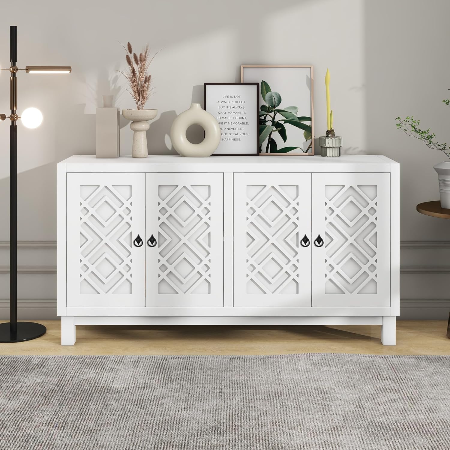 Large Space Multifunctional Buffet Cabinet, with 4 Doors and Adjustable Shelves, Storage Sideboard Console Table, Wood Cupboard with Pull Ring Handles, for Living Dining Room, White