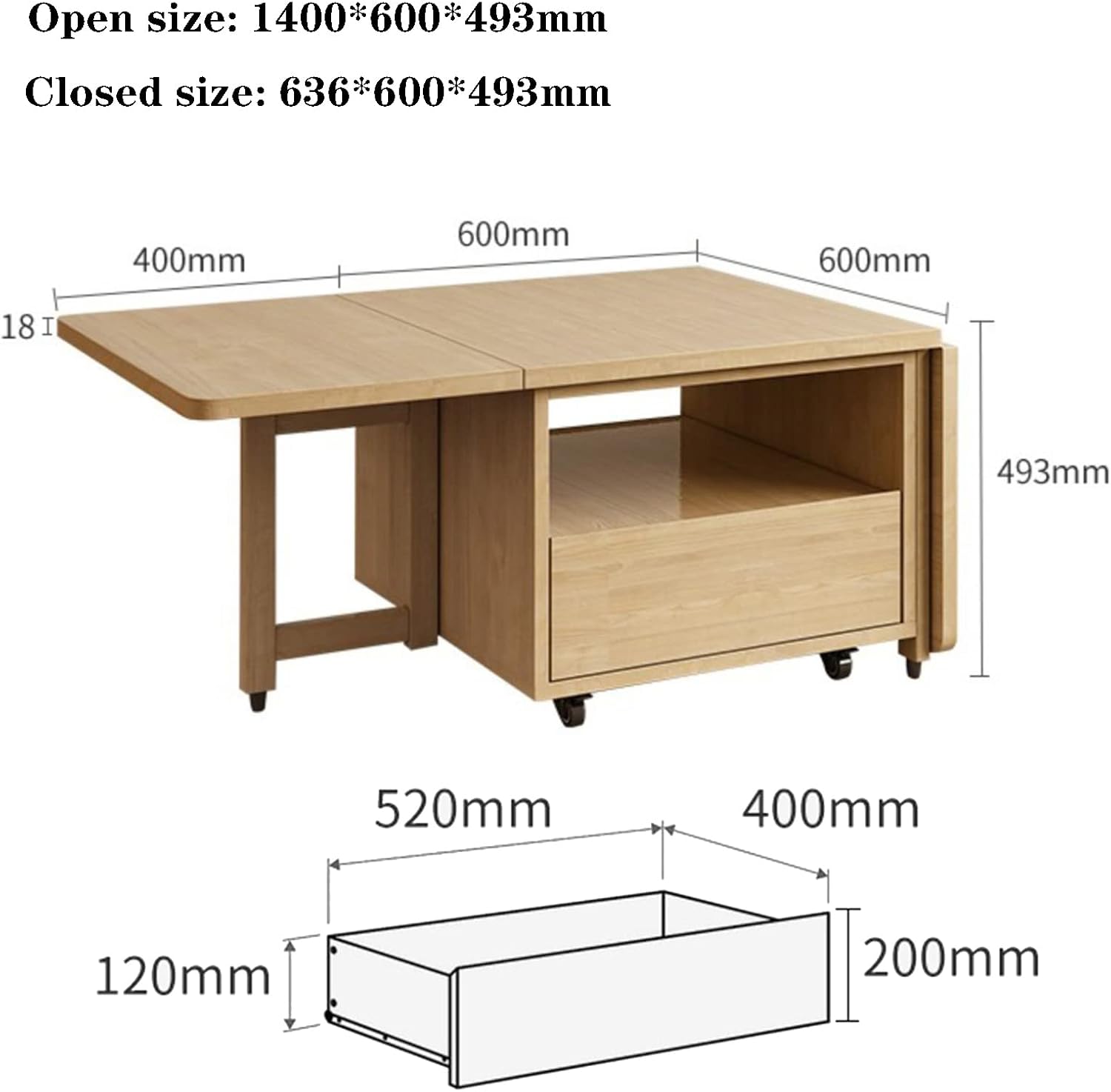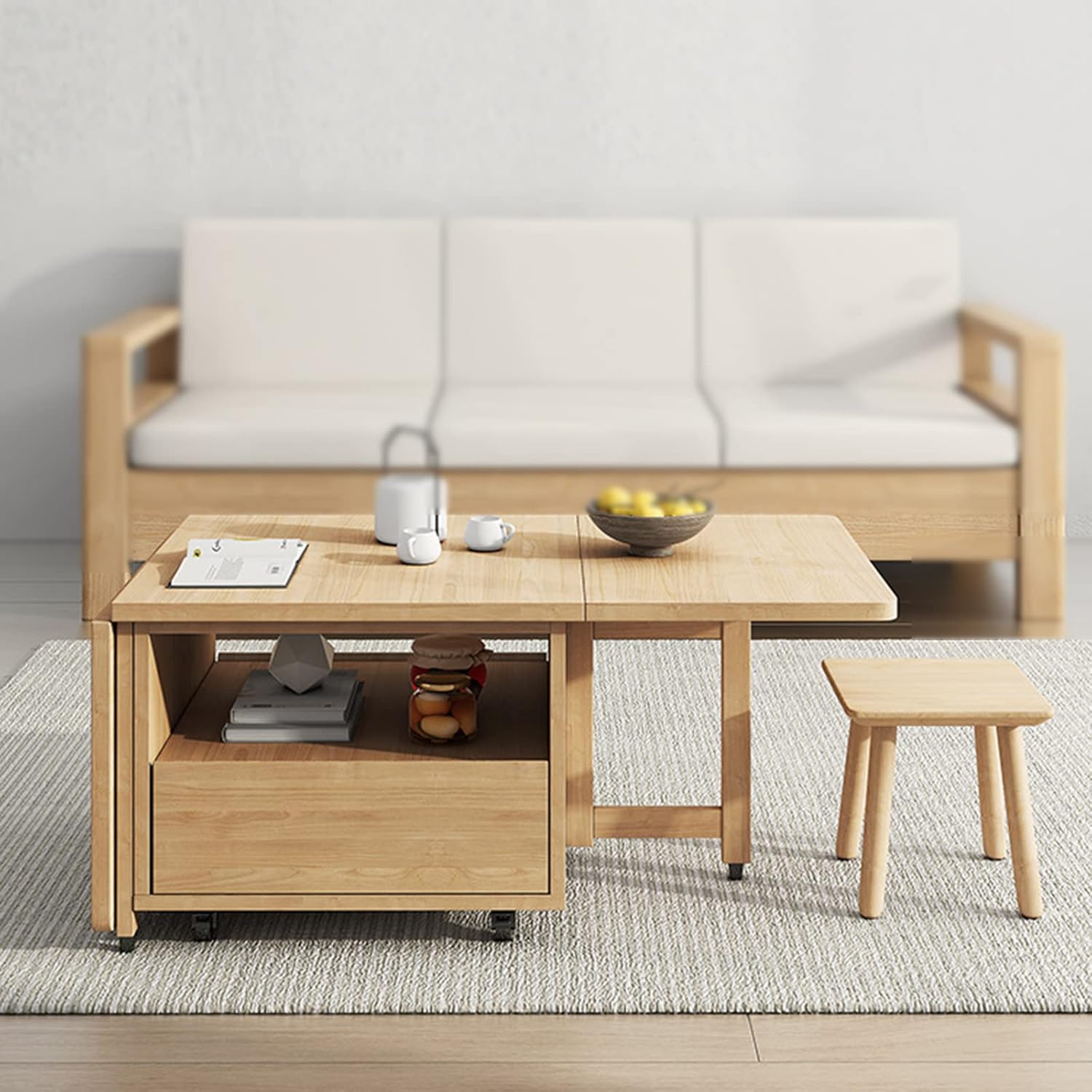 Folding Coffee Table, Multifunctional Dining Table, Solid Wood Drop-Leaf Tea Table with Rollers, Save Space, for Living Room Dining Kitchen Bedroom Furniture, 1.4m, Wood Color