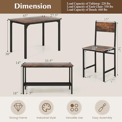 KOTEK Dining Table Set for 4, Kitchen Table Set with Chairs & Bench, Kitchen Table and Chairs Set of 4 w/Metal Frame & Storage Rack, Space Saving Dinette Set, Modern Dining Room Table Set (Coffee)
