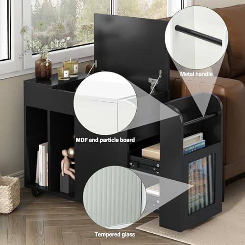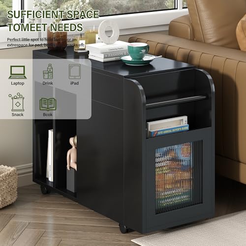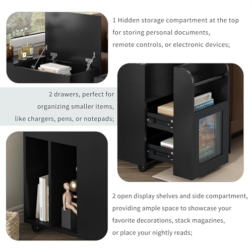 27" Multifunctional Living Room Side Table with Storage,Sofa End Table Lockable Wheels, Night Stand with Storge,Bedside Table with 2 Drawers and Magazine Storage Space(Black)