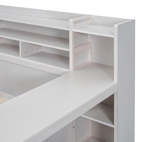 Wooden Full Size Daybed with Storage Shelves and Study Desk, Multi-functional Bed DayBed Frame with 2 Storage Drawers for Office Living Room Bedroom, Maximize Space (Natural-AT)