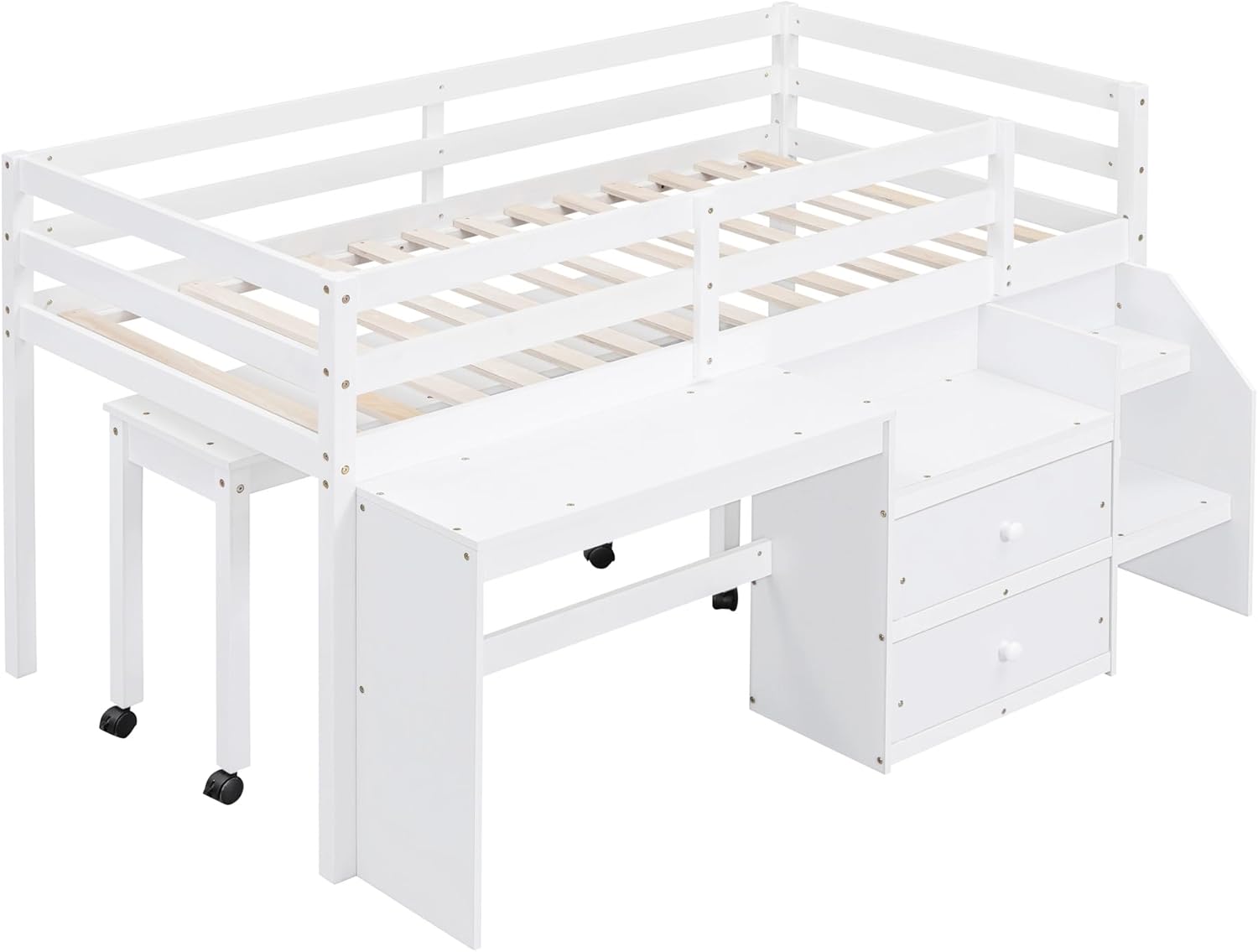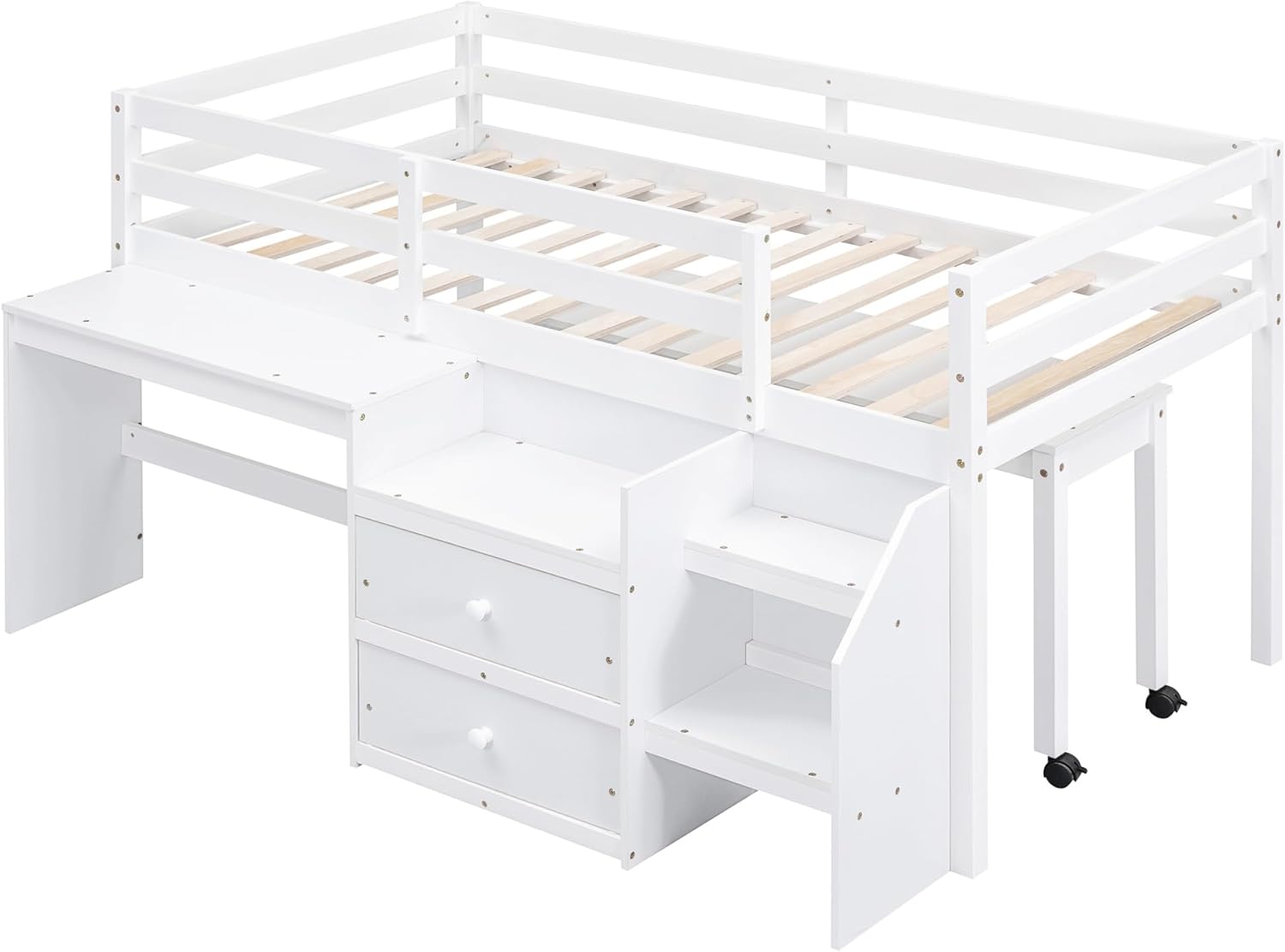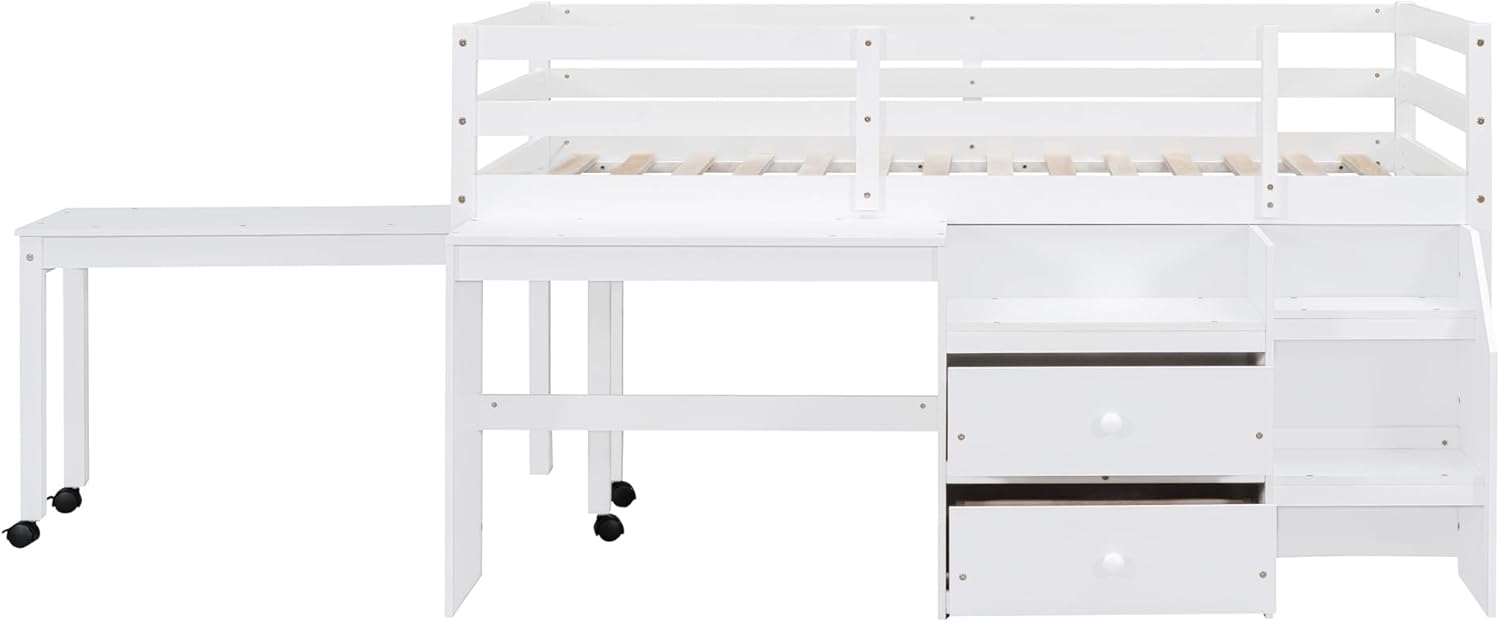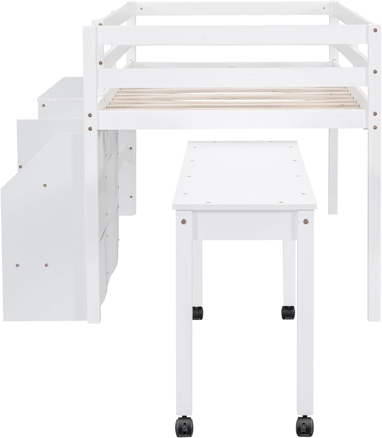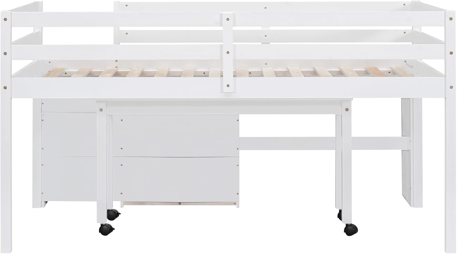 Twin Size Wooden Loft Bed with Desk and Drawers, Lateral Portable Desk, White - Space-Saving and Multi-Functional Bed for Kids, 79.50x54.20x43.30 in.