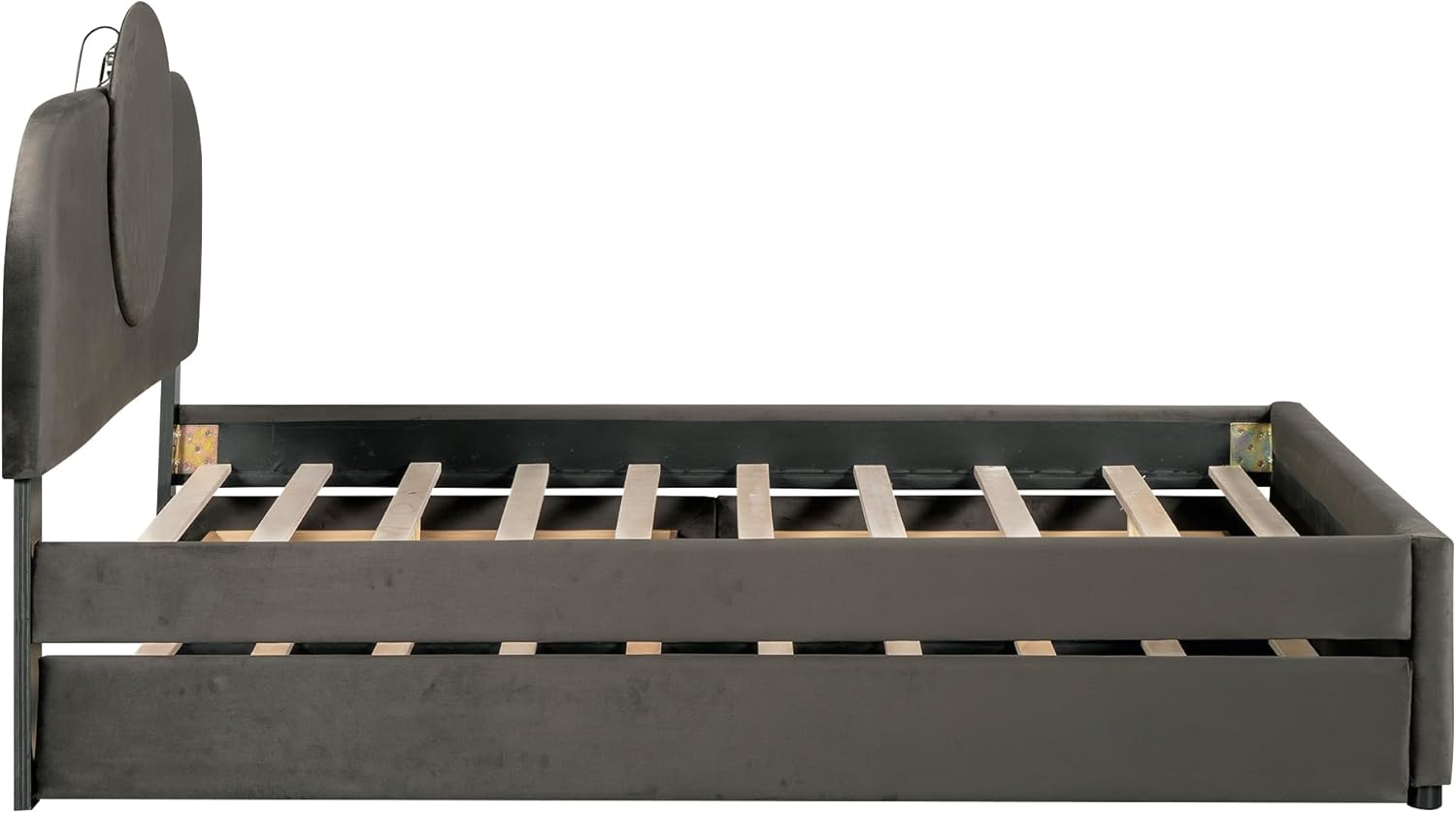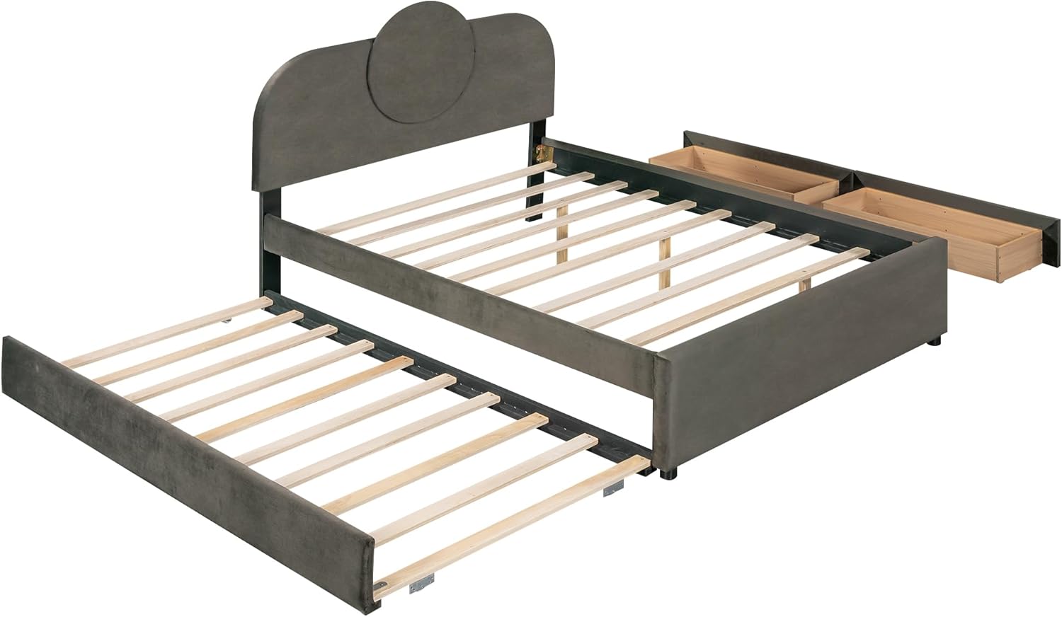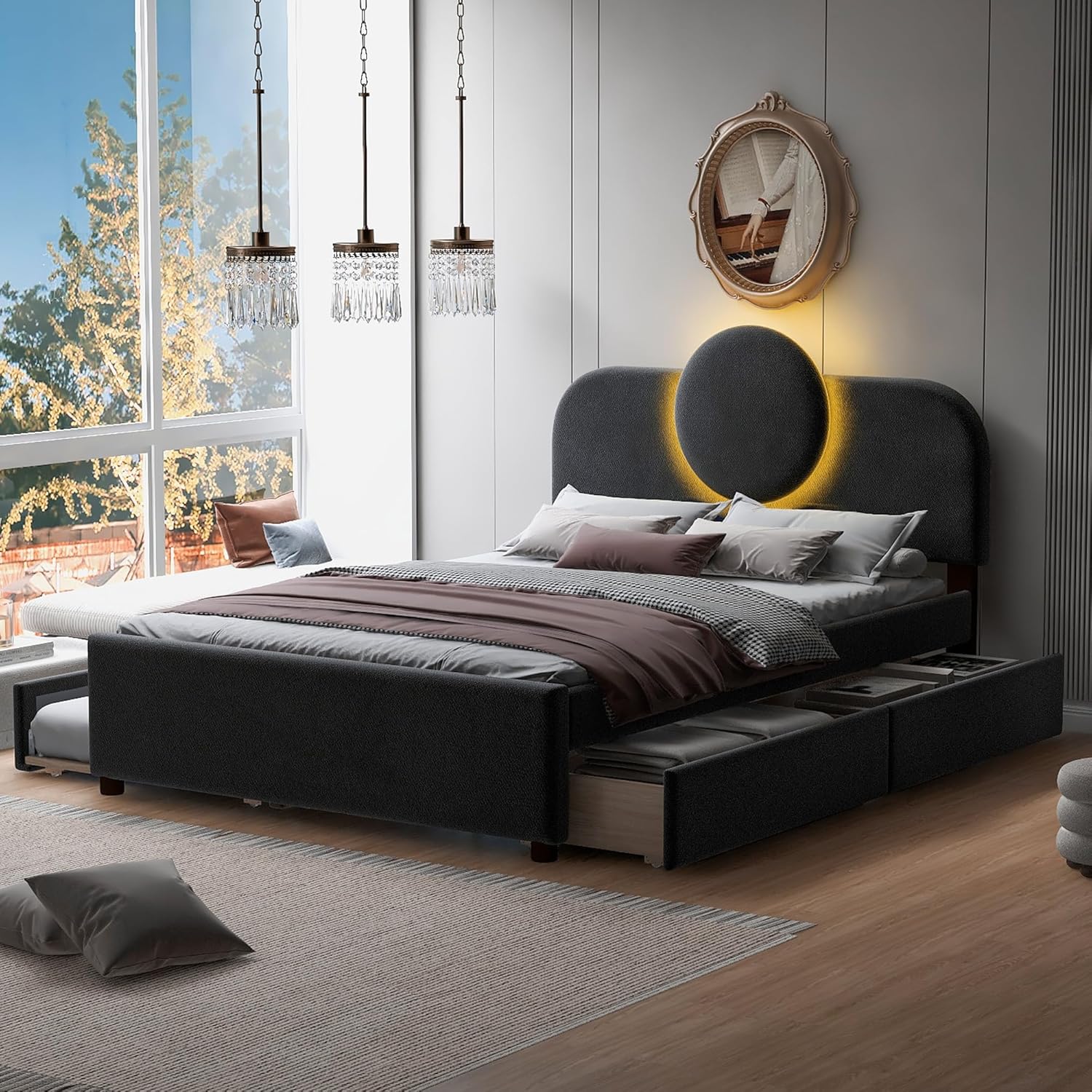 Full Size Upholstered Platform Bed with Multi-Functional LED Headboard, Wooden Beds Frame with Trundle and 2 Storage Drawers, Space Saving, No Box Spring Needed, Gray