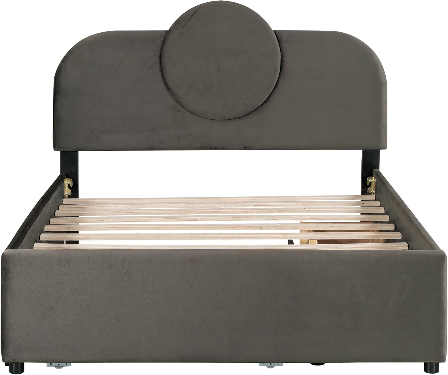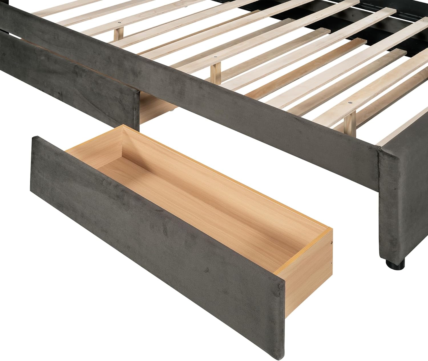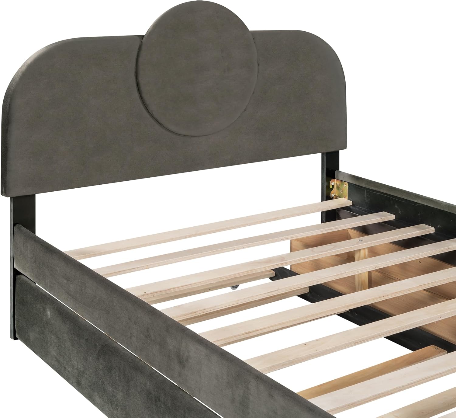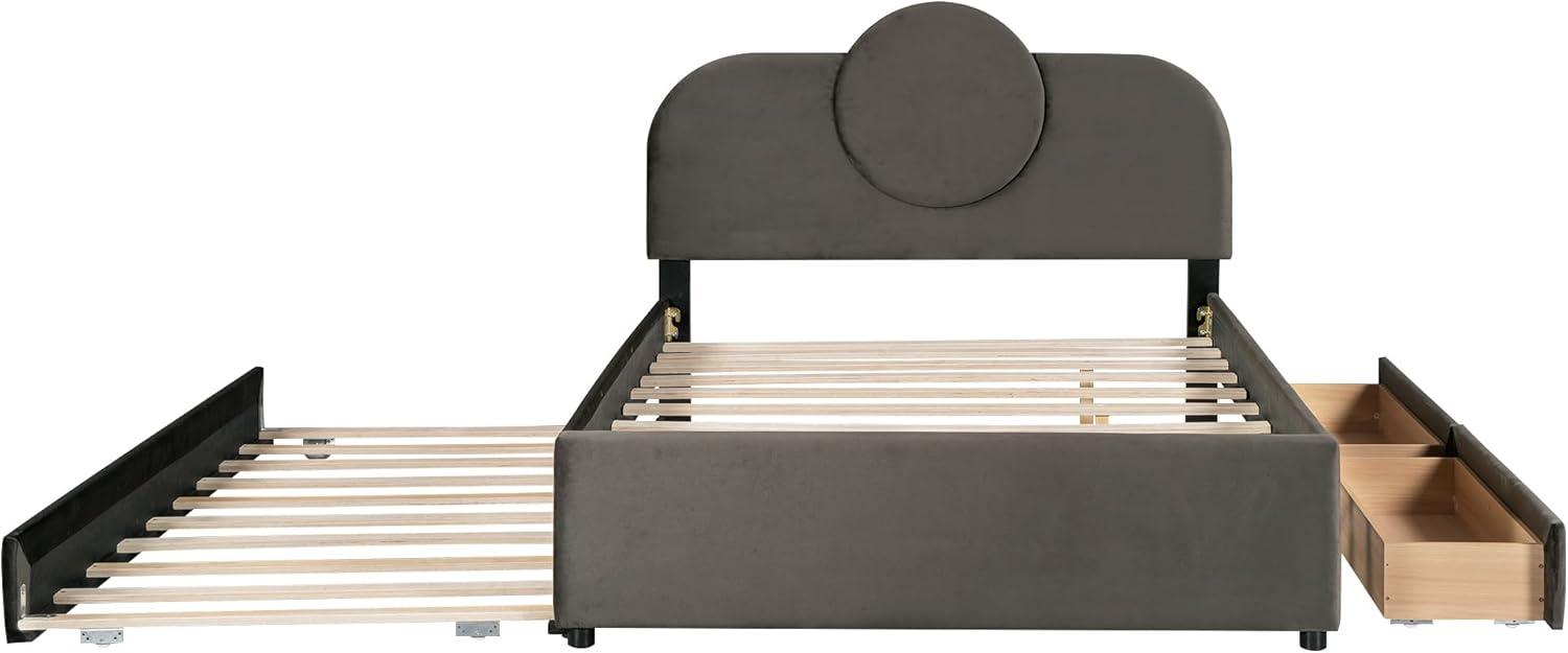 Full Size Upholstered Platform Bed with Multi-Functional LED Headboard, Wooden Beds Frame with Trundle and 2 Storage Drawers, Space Saving, No Box Spring Needed, Gray