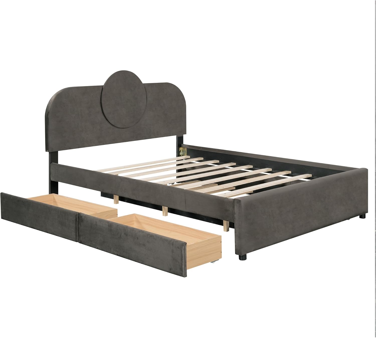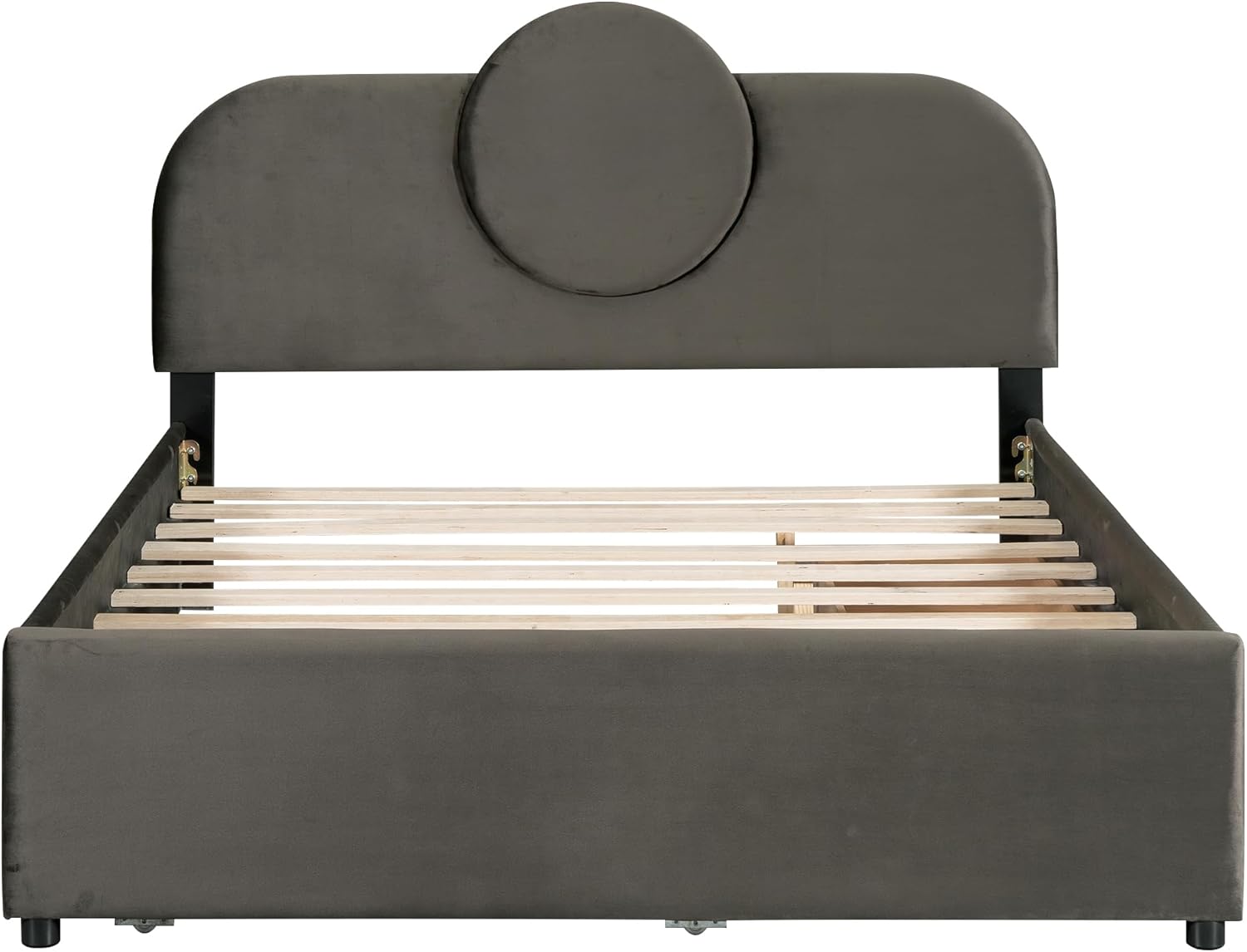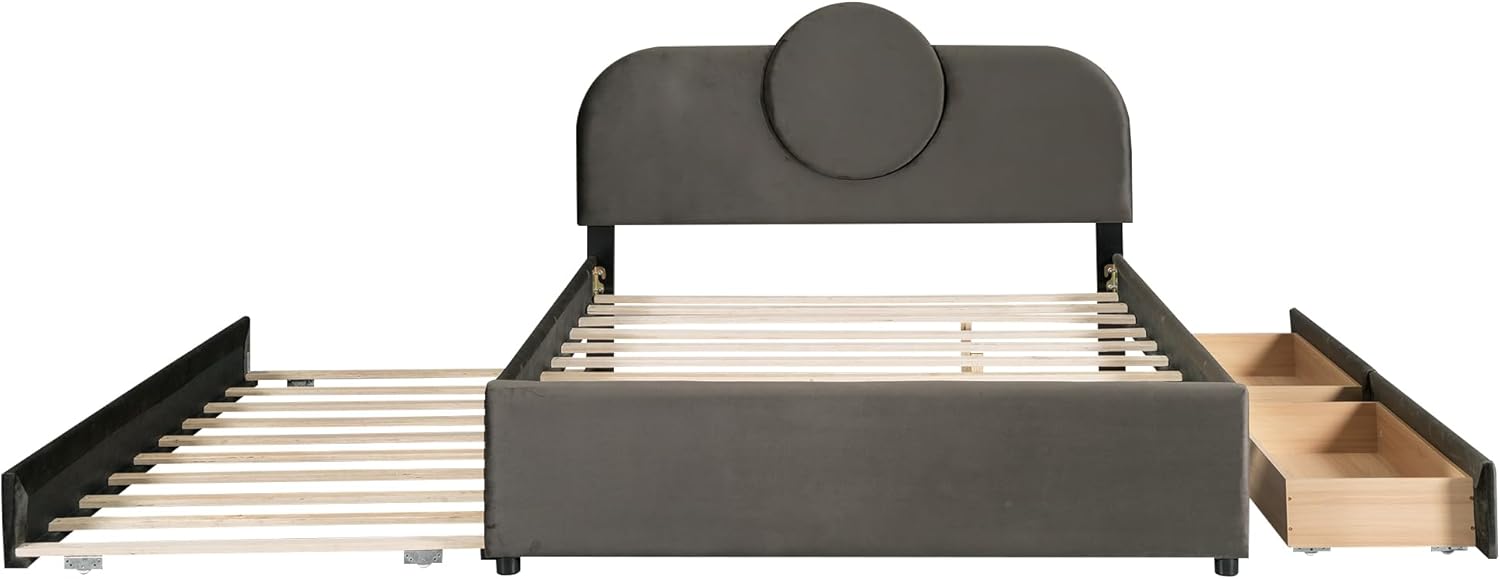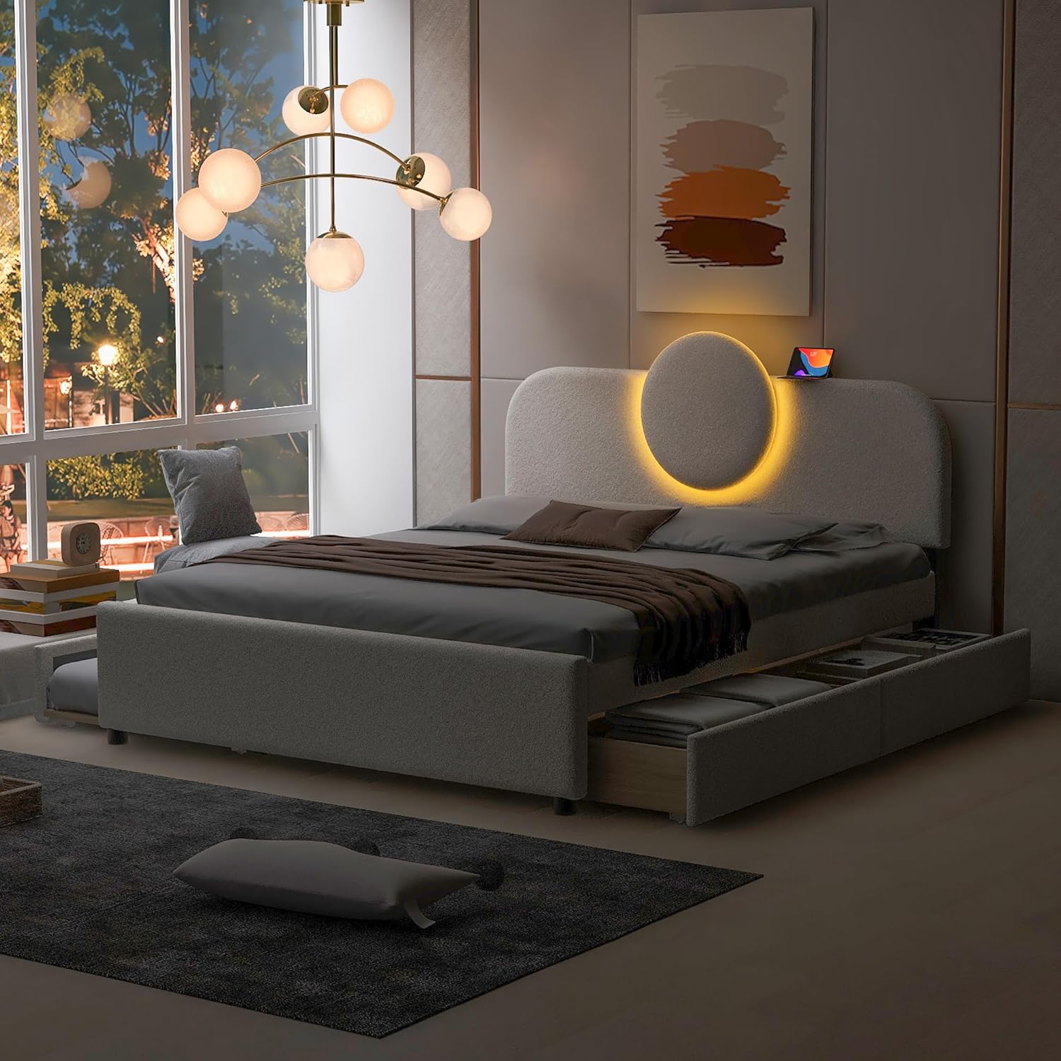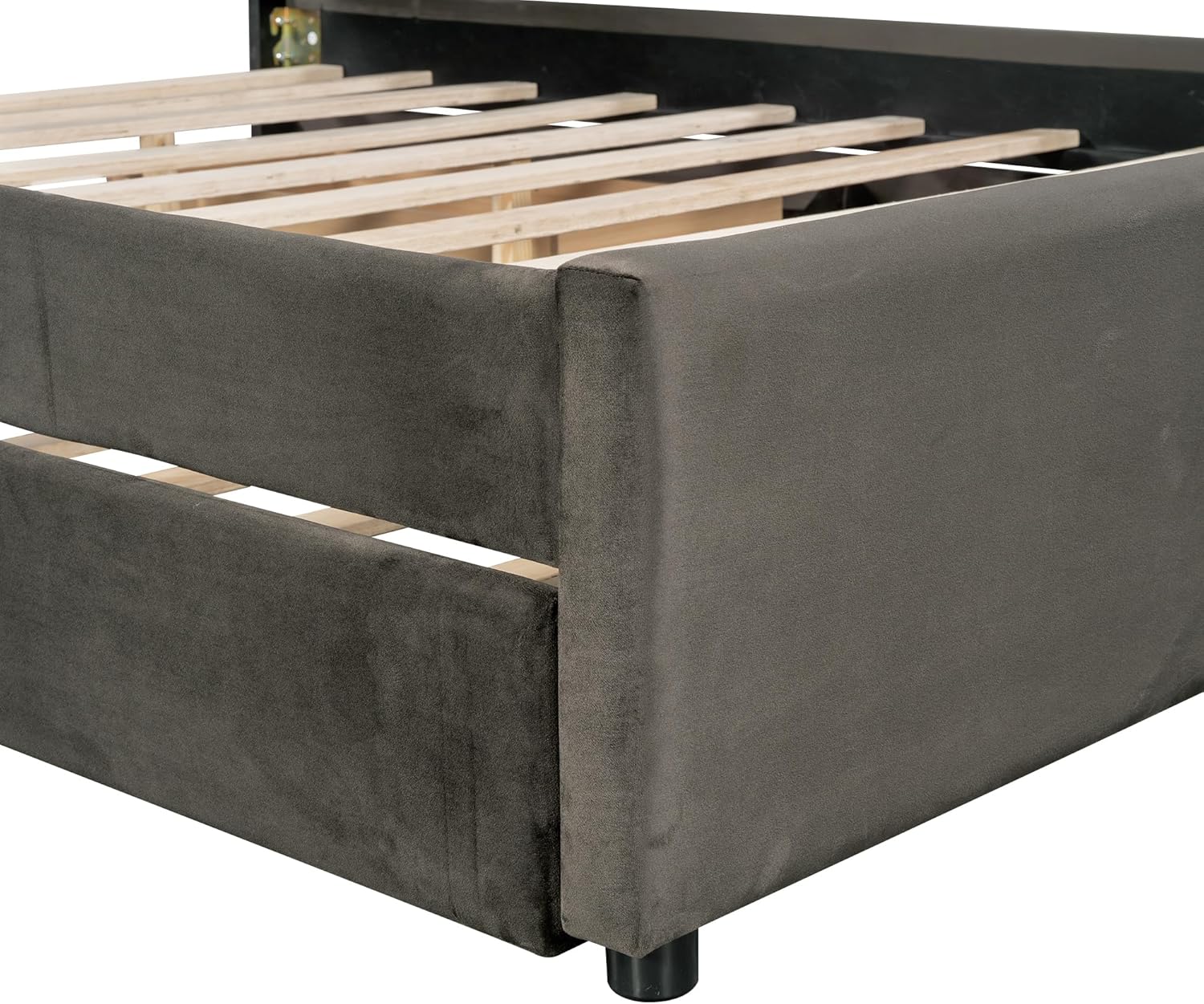 Queen Size Upholstered Platform Bed with Multi-Functional LED Headboard, Wooden Beds Frame with Trundle and 2 Storage Drawers, Space Saving, No Box Spring Needed, Gray