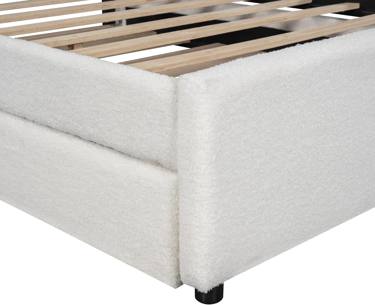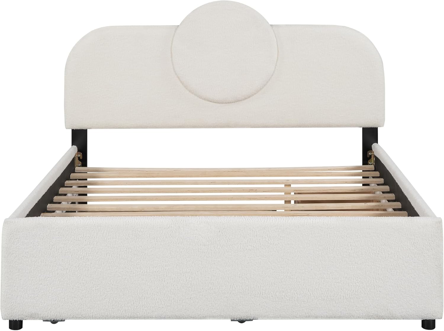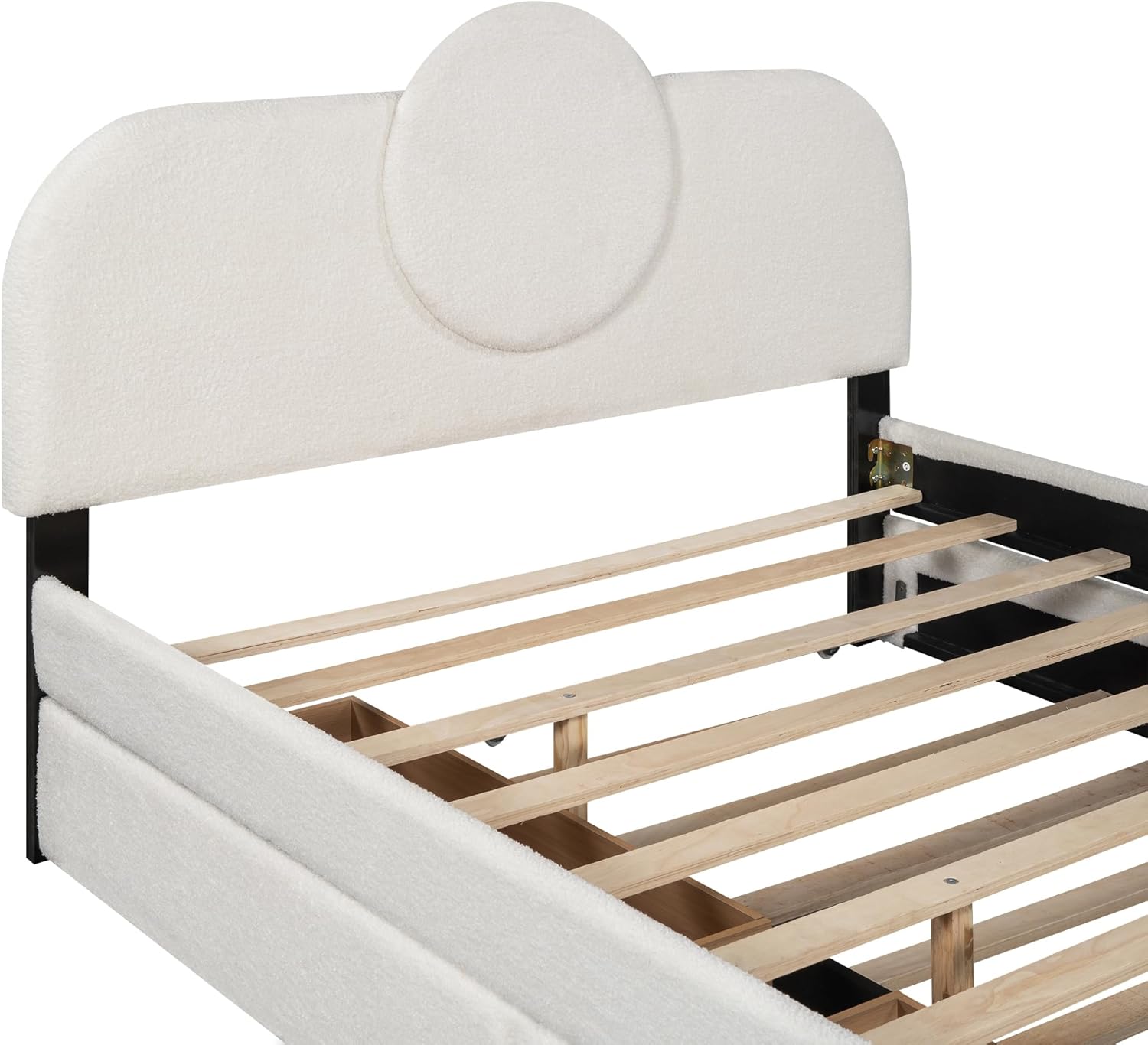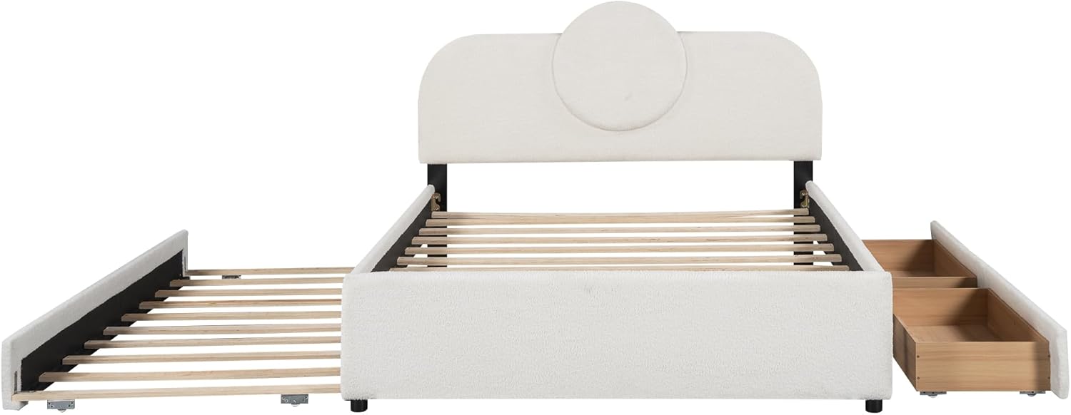 Queen Size Upholstered Platform Bed with Multi-Functional LED Headboard, Wooden Beds Frame with Trundle and 2 Storage Drawers, Space Saving, No Box Spring Needed, White