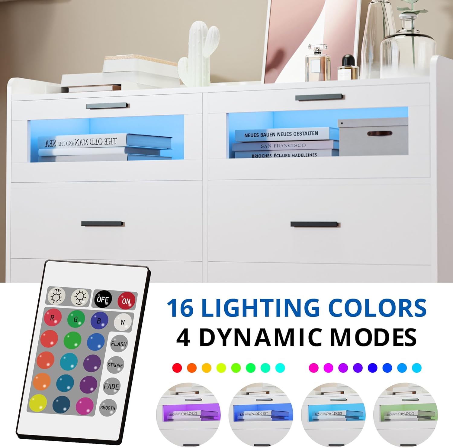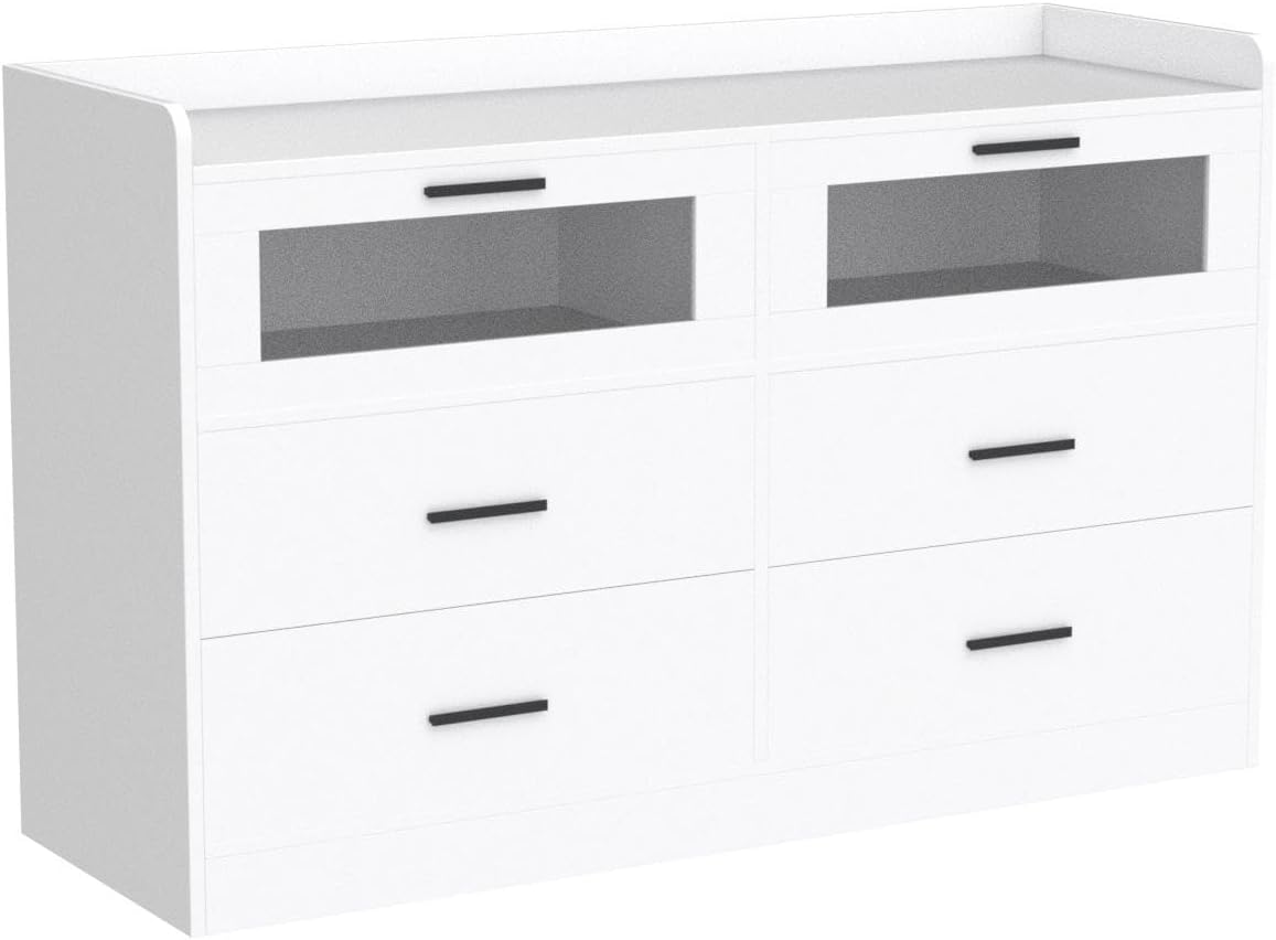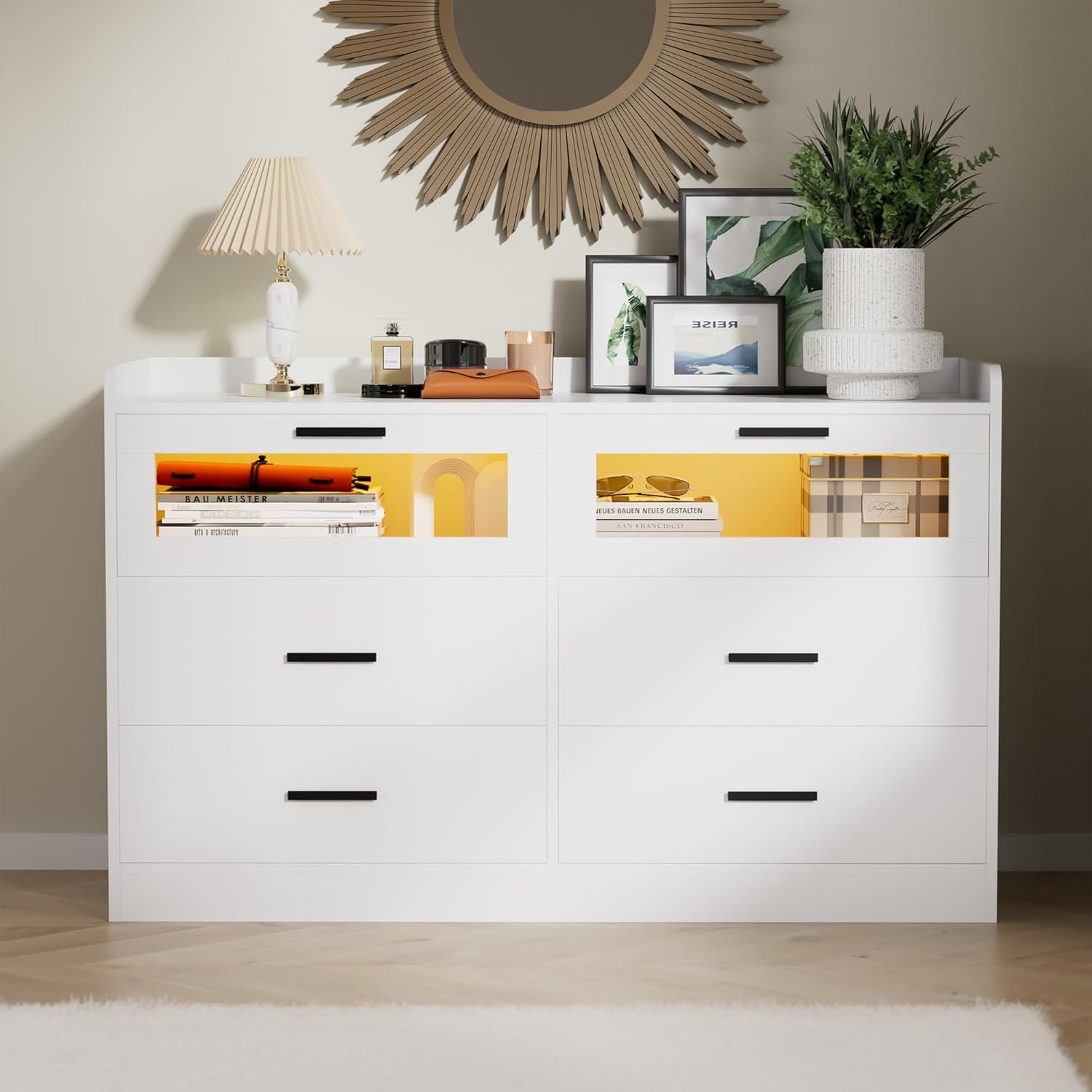 Cozy Castle 6 Drawer Double Dressers LED Modern Chest of Drawers Large Organizer Wood Accent Storage Cabinets for Living Room Home Office Entryway, White