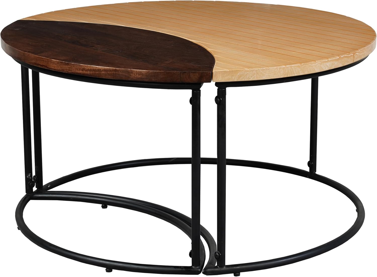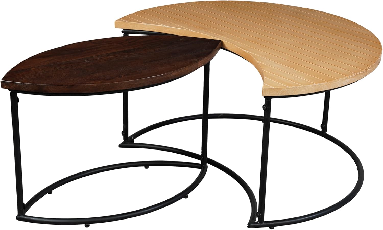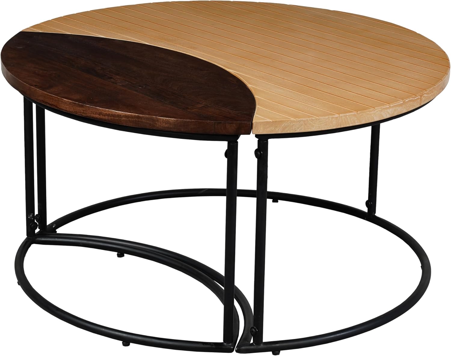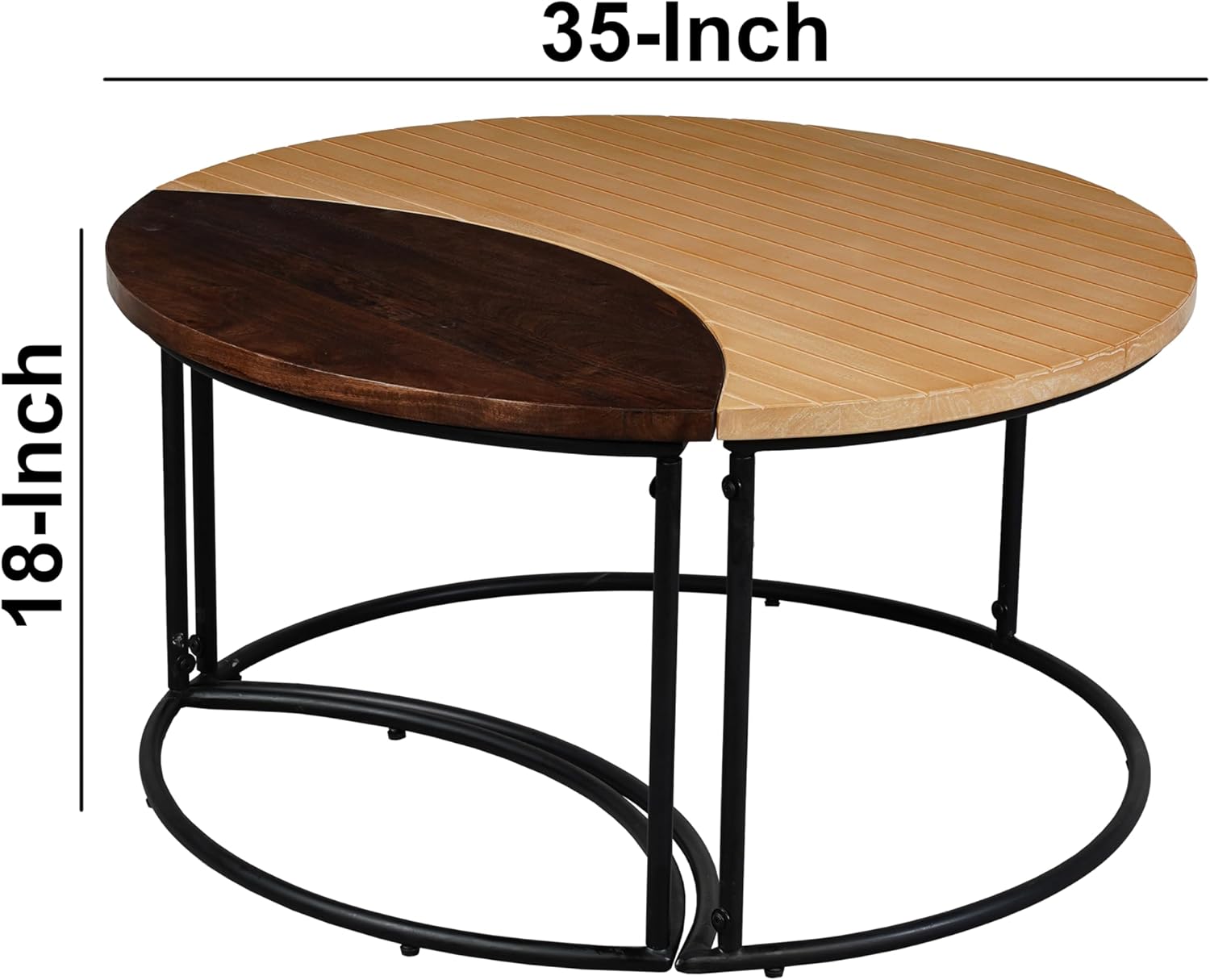 The Urban Port 35 Inch Round Crescent Mango Wood Coffee Nesting Tables with Metal Frame, Set of 2, Dark and Natural Brown