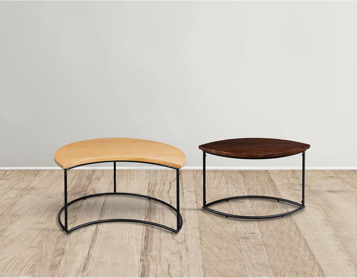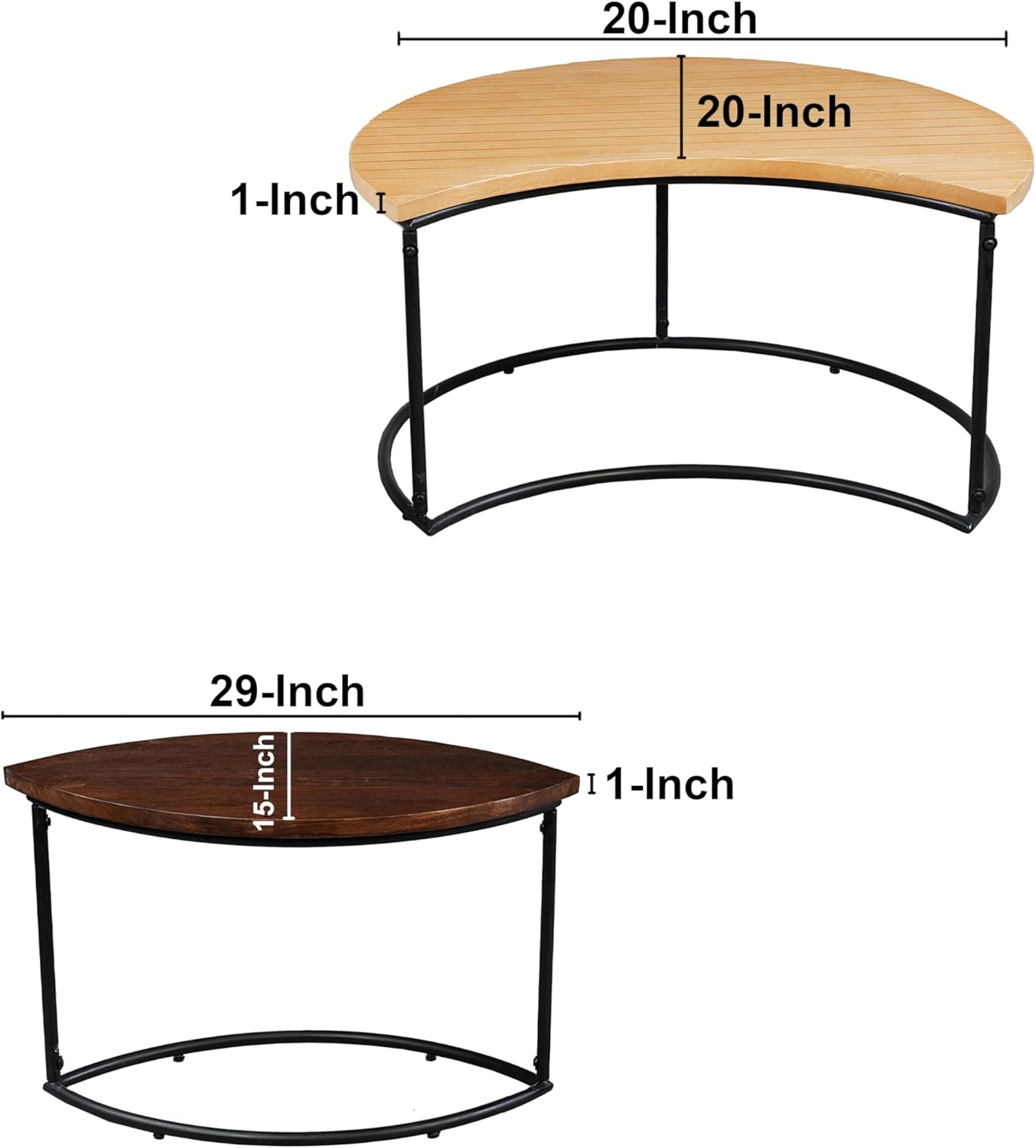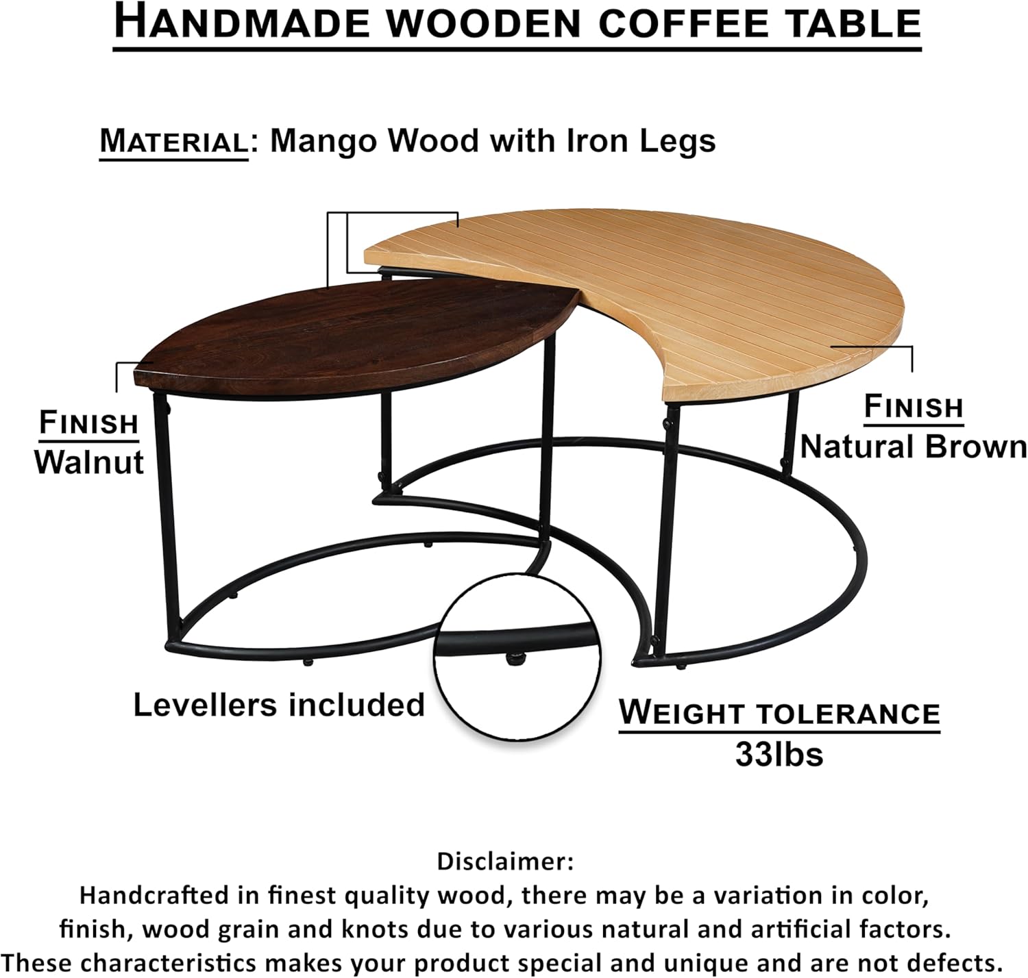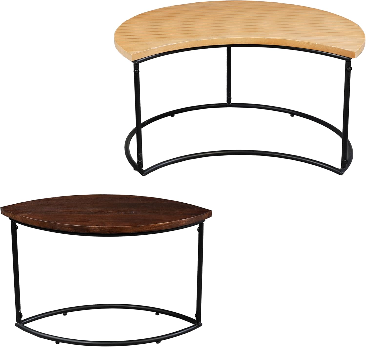 The Urban Port 35 Inch Round Crescent Mango Wood Coffee Nesting Tables with Metal Frame, Set of 2, Dark and Natural Brown