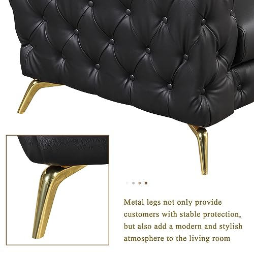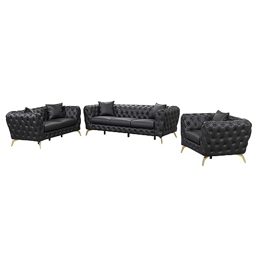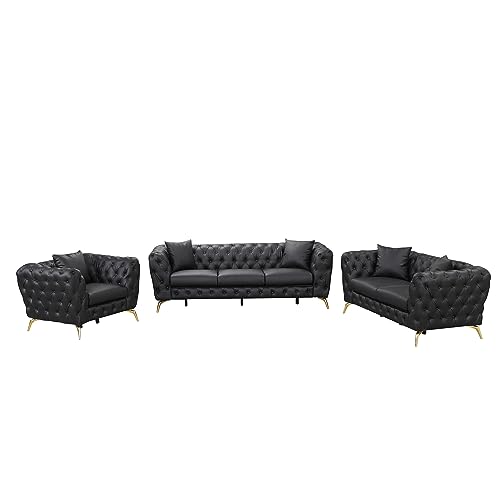 Modern 3-Piece Sofa Sets with Sturdy Metal Legs, Button Tufted Back, PU Upholstered Couches Sets Including Three Seat Sofa, Loveseat and Single Chair for Living Room Furniture Set, Black Sofas & Couch