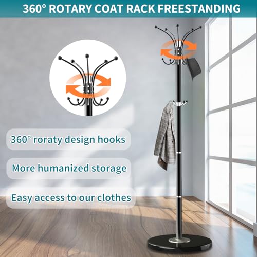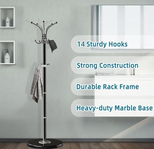 Coat Rack with Natural Marble Base, Solid 201 Stainless Steel Coat Rack Freestanding, Coat Rack Stand with 8 Hooks, Coat Tree Hats Hanger for Entryway, Hallway (Silver)