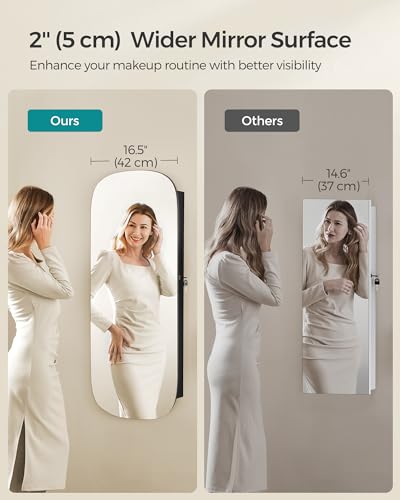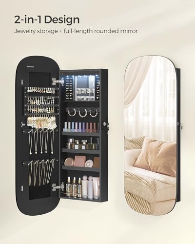SONGMICS Jewelry Organizer, LED Jewelry Cabinet Wall or Door Mounted, Lockable Rounded Wide Mirror with Storage, Interior Mirror, 3.9 x 16.5 x 42.5 Inches, Black Surface with Black Lining