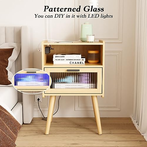 Mid Century Modern Nightstand, Side Table with Storage, Bedside Tables with Acrylic Drawer, End Table with Solid Wood Legs for Bedroom, Living Room and Small Spaces, Black