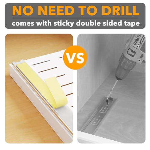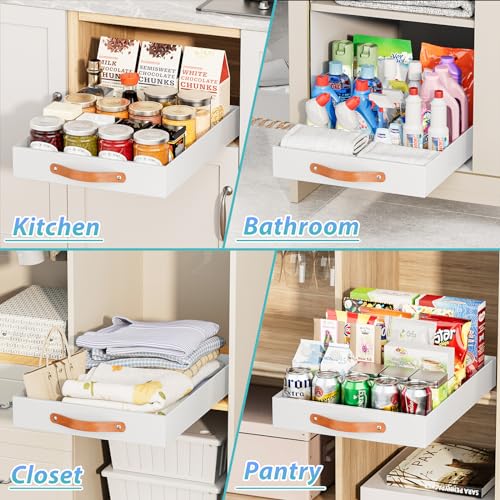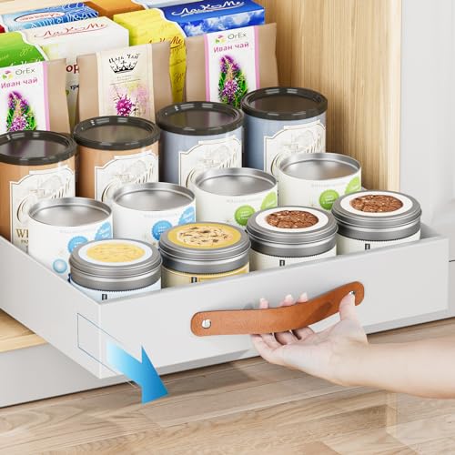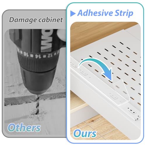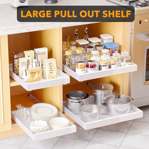 OVICAR Pull Out Cabinet Drawer - Adhesive Slide Out Organizer, 13.8" W x 16.3" D Heavy Duty Sliding Drawers Pantry Shelves Storage with 4pcs Divider Racks for Kitchen Bathroom Home, White