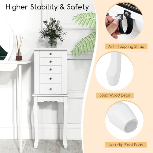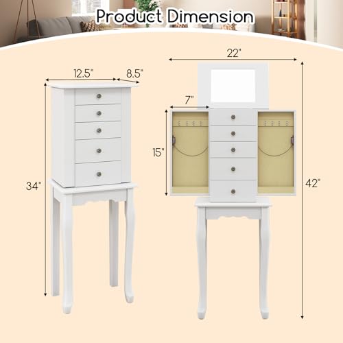 Giantex Jewelry Cabinet Armoire Chest with 4 Drawers, Flip Top Mirror, Top Storage Compartments, 2 Side Doors with 8 Necklace Hooks, 2 Shelves, White Standing Jewelry Organizer Box for Girls Gift