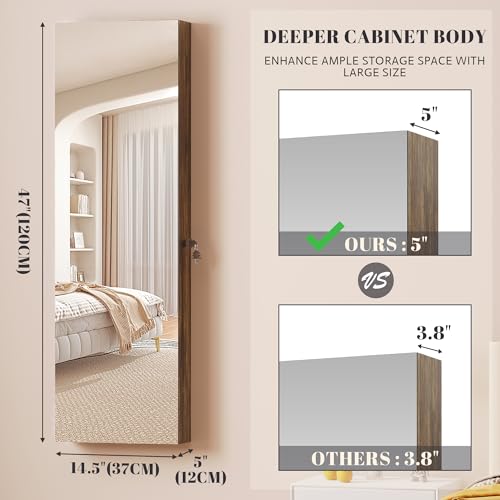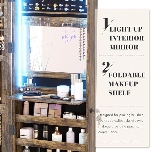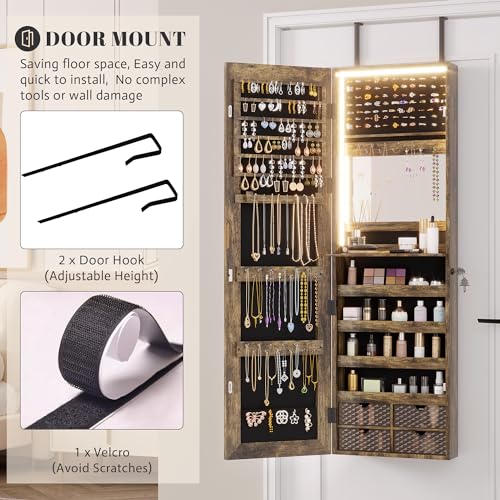 Vlsrka 47.2" LED Grey Jewelry Mirror Cabinet, Wall/Door Mounted Jewelry Armoire Organizer with Full-Length Mirror, Large Capacity Storage Hanging Cabinet, 4 Drawers, 5 Shelves, Built-in Lighted Mirror