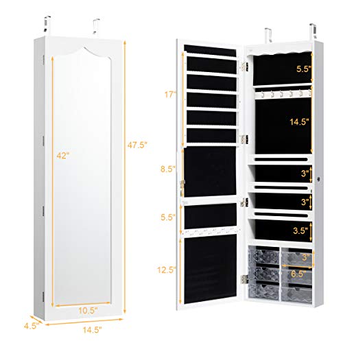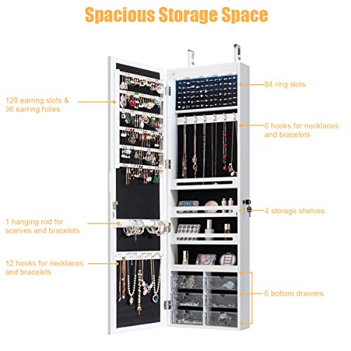 CHARMAID Jewelry Cabinet Armoire, Wall Mount Door Hanging, Lockable Jewelry Organizer with 47.5'' Full Length Mirror, 5 Lights, Large Jewelry Storage Box with 6 Acrylic Drawers (White)