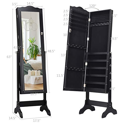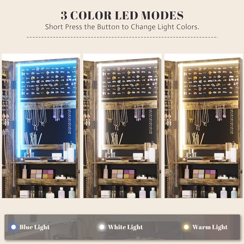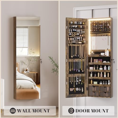 Giantex Jewelry Armoire Organizer with Full Length Mirror, 14 LEDs Floor Standing Jewelry Cabinet with 2 Drawers, 4 Adjustable Angles, Lockable Jewelry Storage Box Cabinet (Brown)