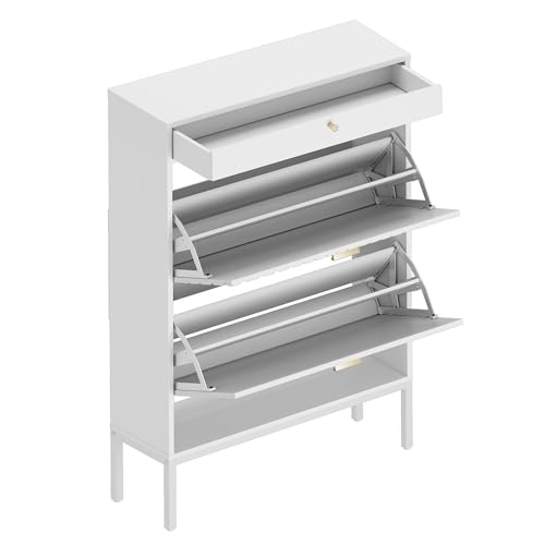 XIAO WEI Shoe Cabinet, Shoe Storage Organizer Cabinet with 2 Flip Wavy Line Drawers, Freestanding Shoe Rack with Adjustable Shelf for Entryway(White)