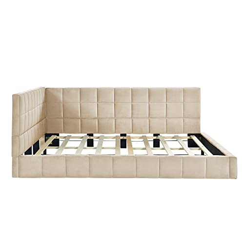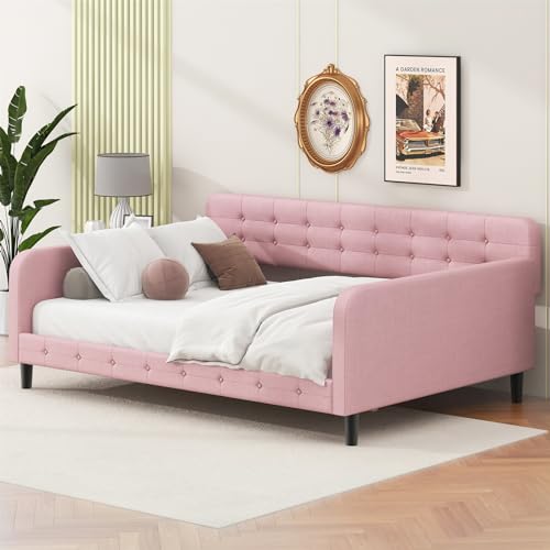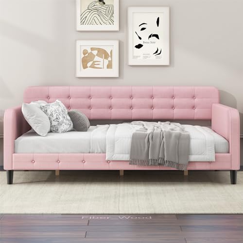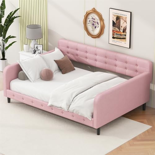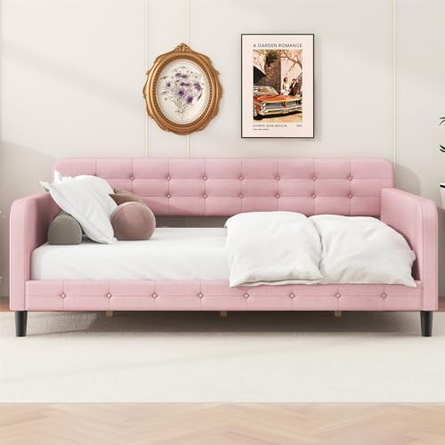 Merax Twin Size Day Bed Frame with 4 Legs,Beige Tufted Linen Sofa Bed for Living Room,Upholstered Daybed Frame Twin Size,No Mattress