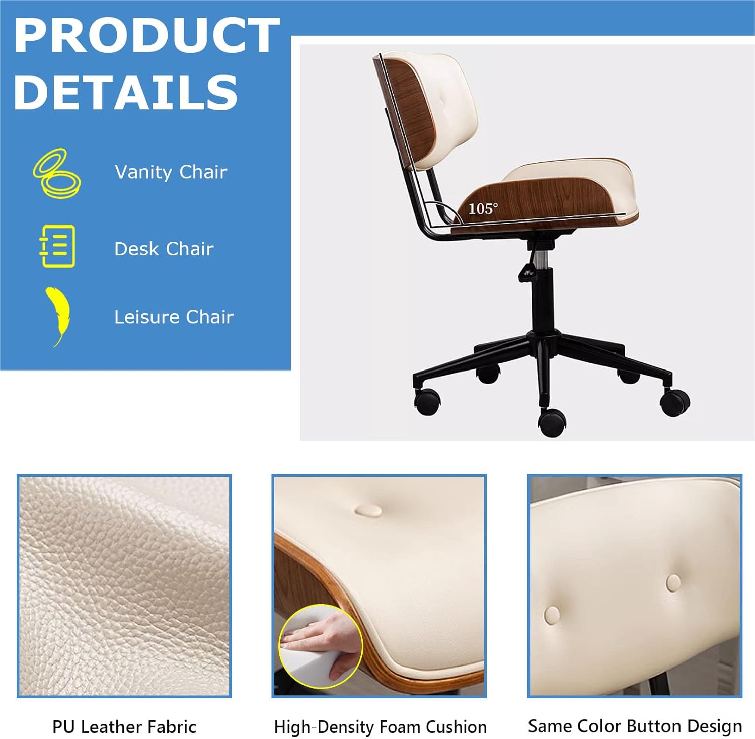 Home Office Chair Ergonomic, Task Chairs with Wheels, PU Leather Computer Desk Chair, Executive Chair with Adjustable Height Swivel Rolling Vanity Chair for Adult (Color : Yellow, Size : with Foot r