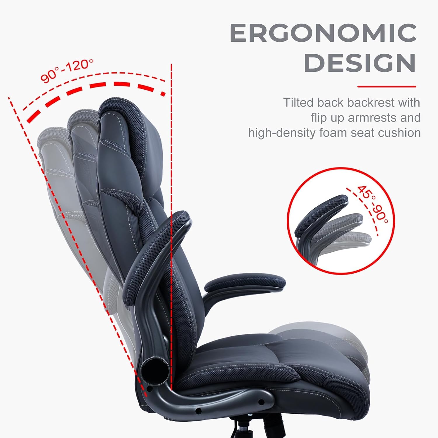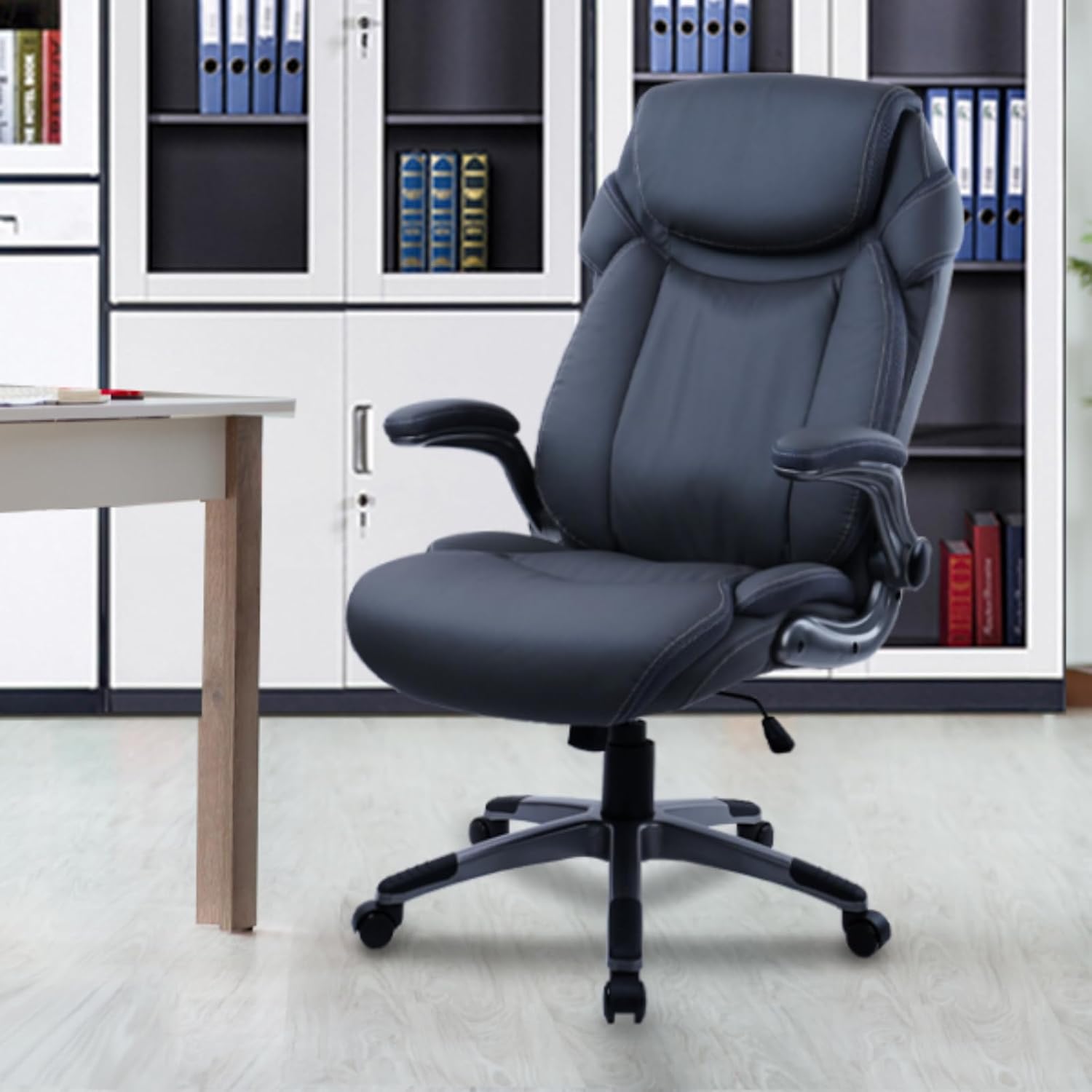 CLATINA Executive Office Chair with Flip-up Armrests, PU Leather High Back Ergonomic Desk Chair Height-Adjustable Swivel Rolling Computer Desk Chair, Grey