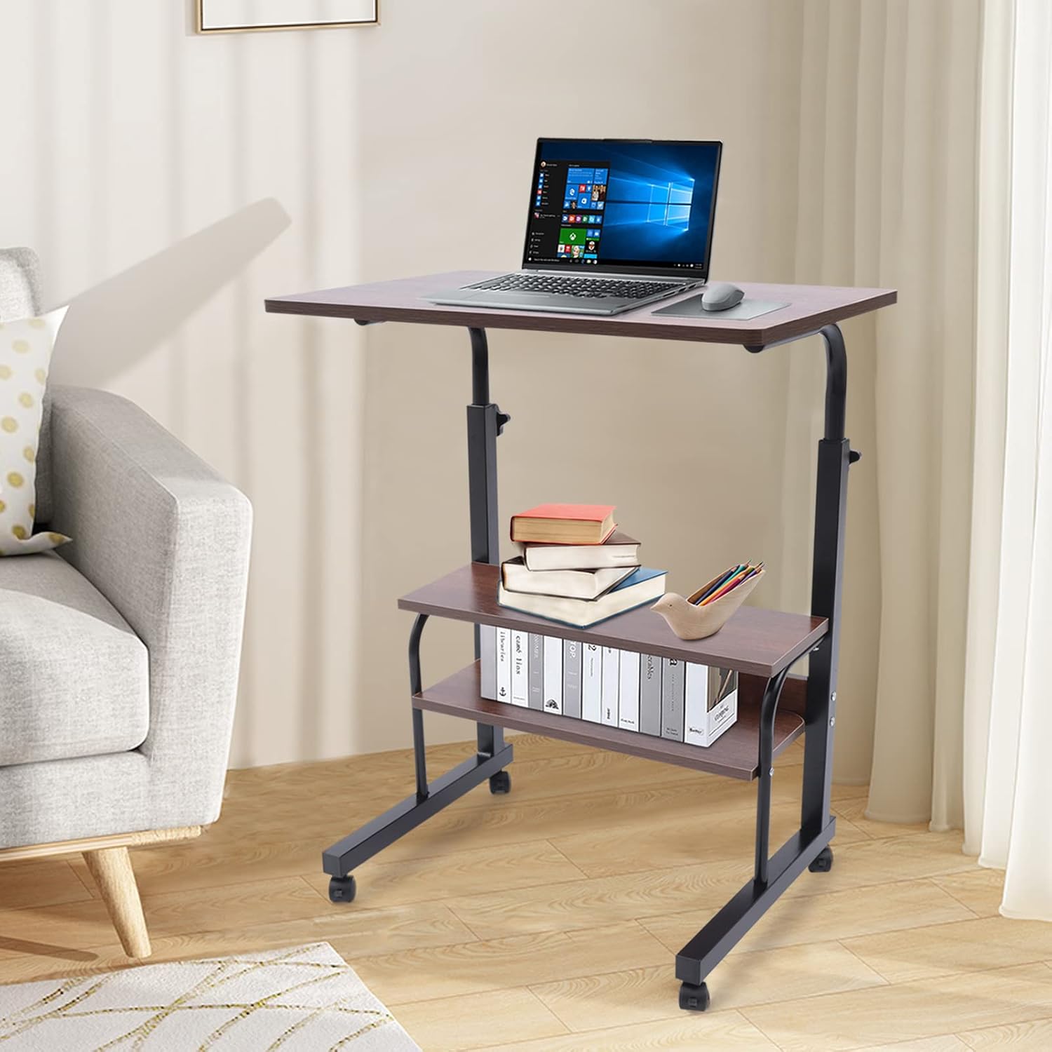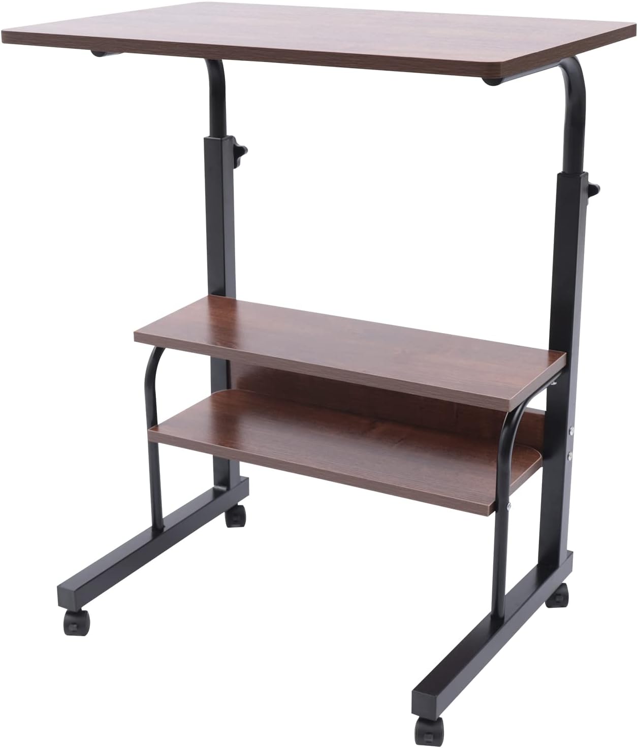 Mobile Side Table, 3 Tier Height Adjustable Rolling Standing Desk with Wheels, Sofa Bed Side Table Laptop Standing Desk for Living Room Bedroom Office, Brown