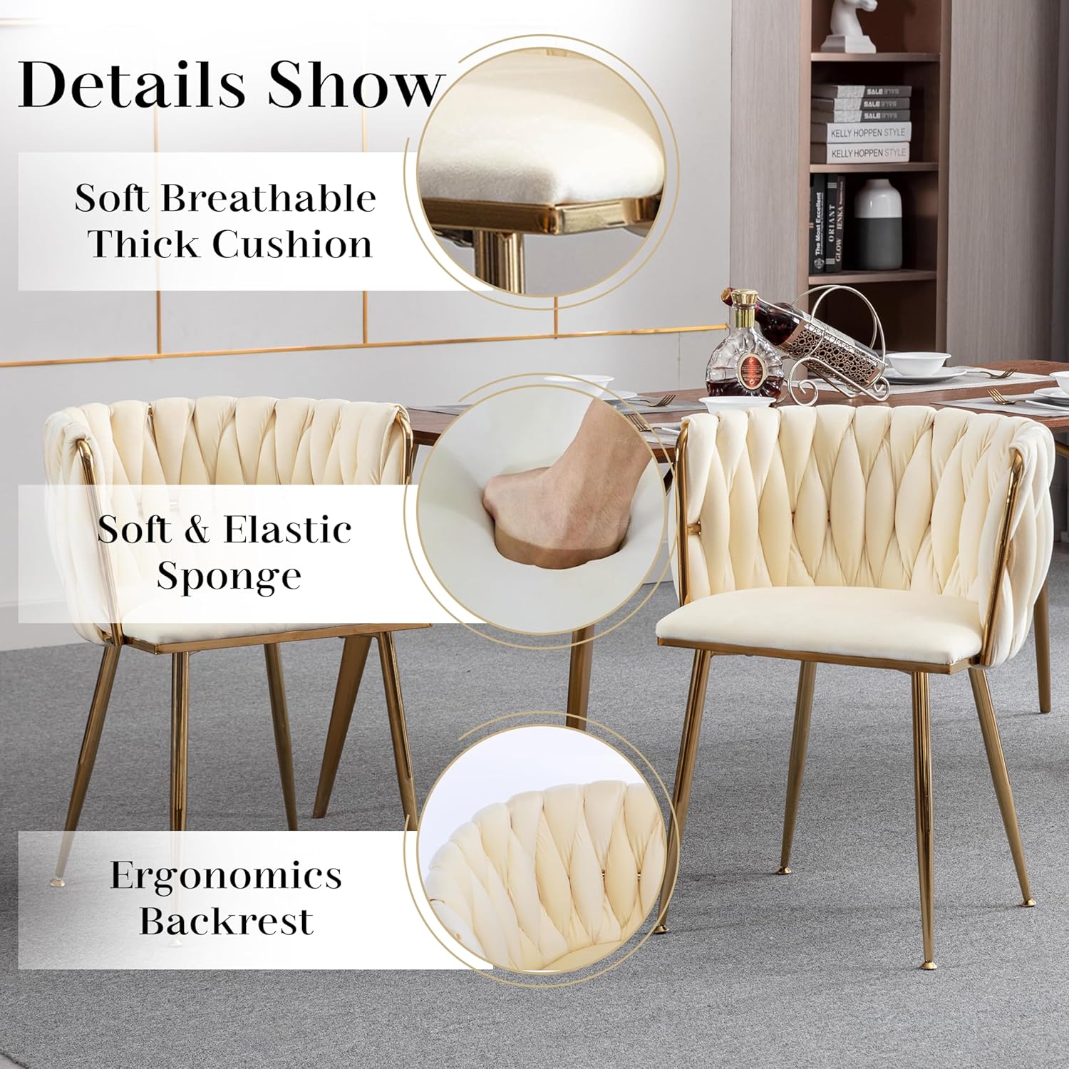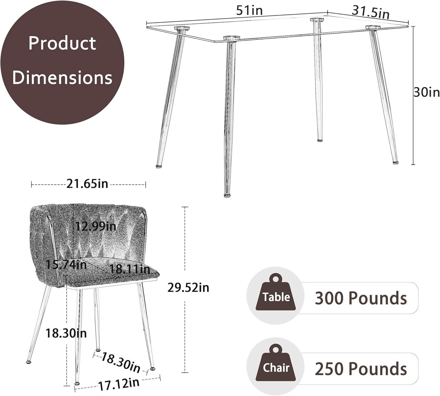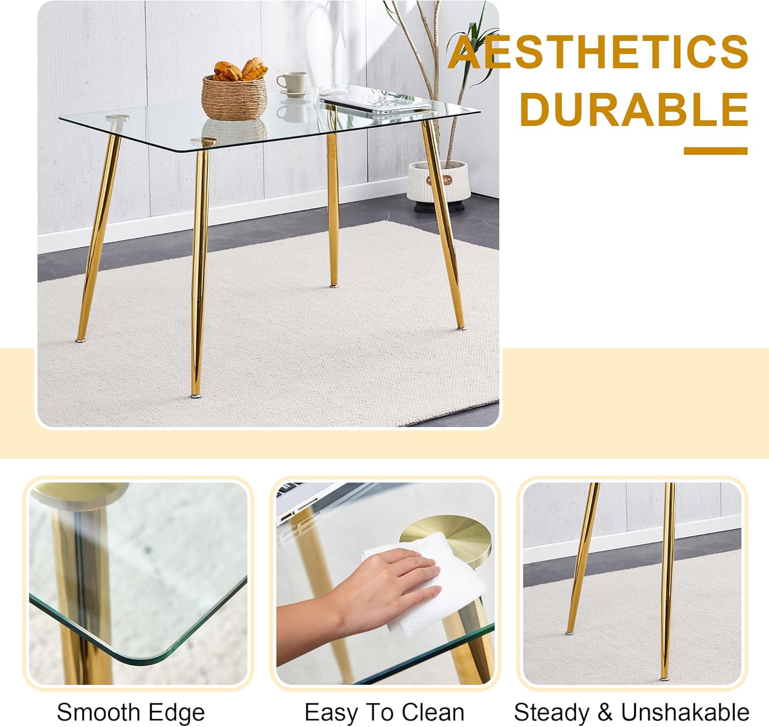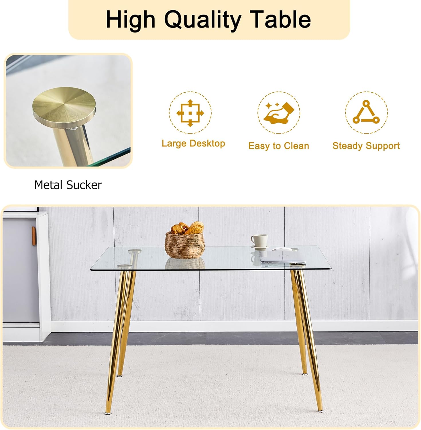 Gold Glass Dining Room Table Set for 4, 51'' Modern Rectangular Dinner Table Set, 5 PCS Clear Glass Top Retro Kitchen Table Set, Beige Woven Dining Chair for Home Living Room Small Place