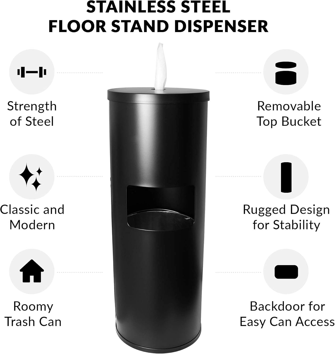 Black Stainless Steel Floor Stand Wipe Dispenser with Built-in Trash Can - Fits Wipes on Rolls - Perfect for Fitness Clubs, Schools/Daycares, Commercial and Residential Facilities