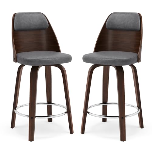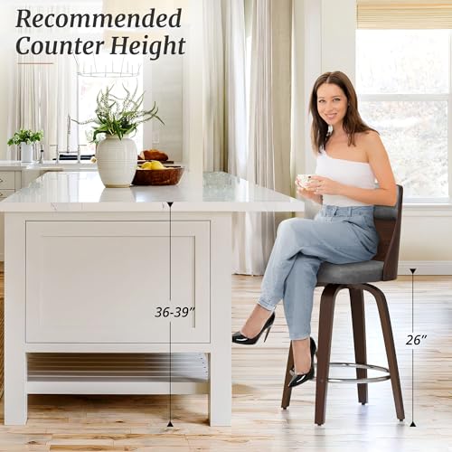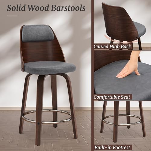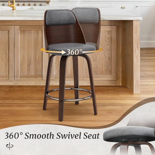 Counter Height Bar Stools Set of 4, Faux Leather Counter Stools, 26" Swivel Bar Stools, Wooden Barstools with High Back, Mid Century Modern Bar Stools for Kitchen Island, Yellowish Brown
